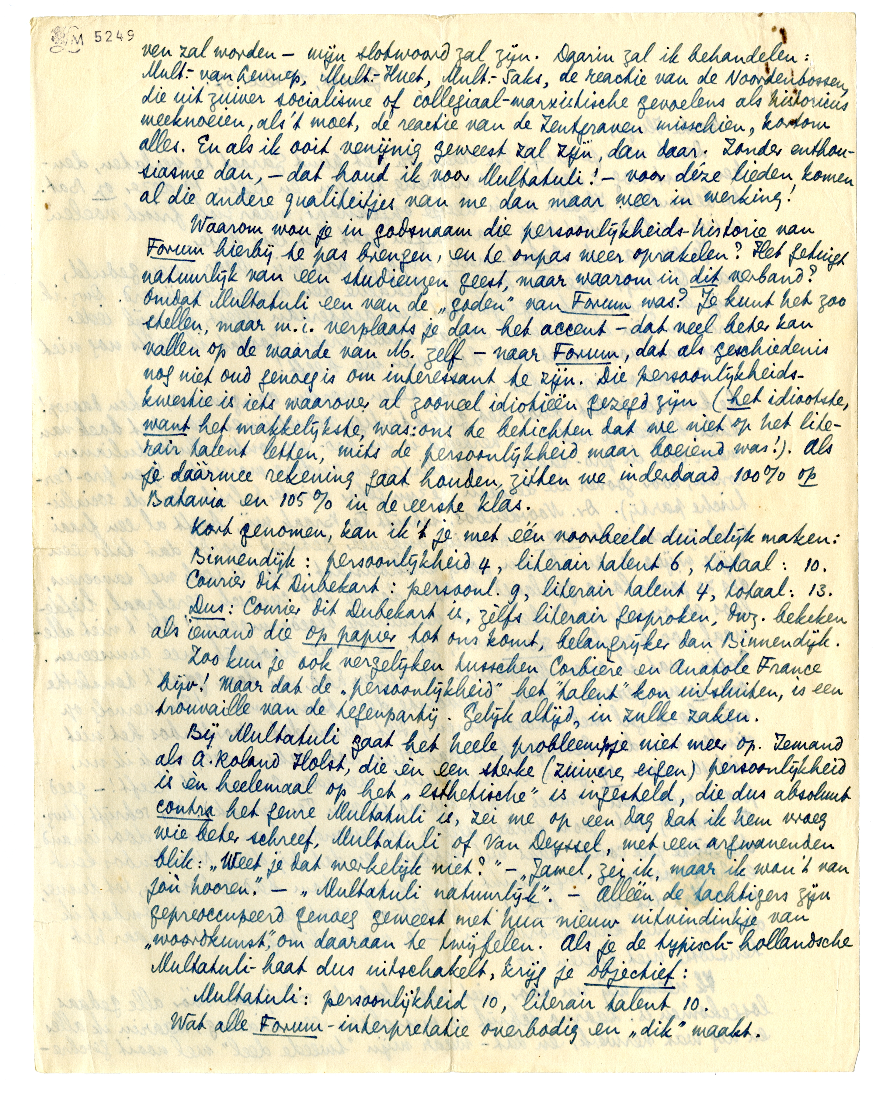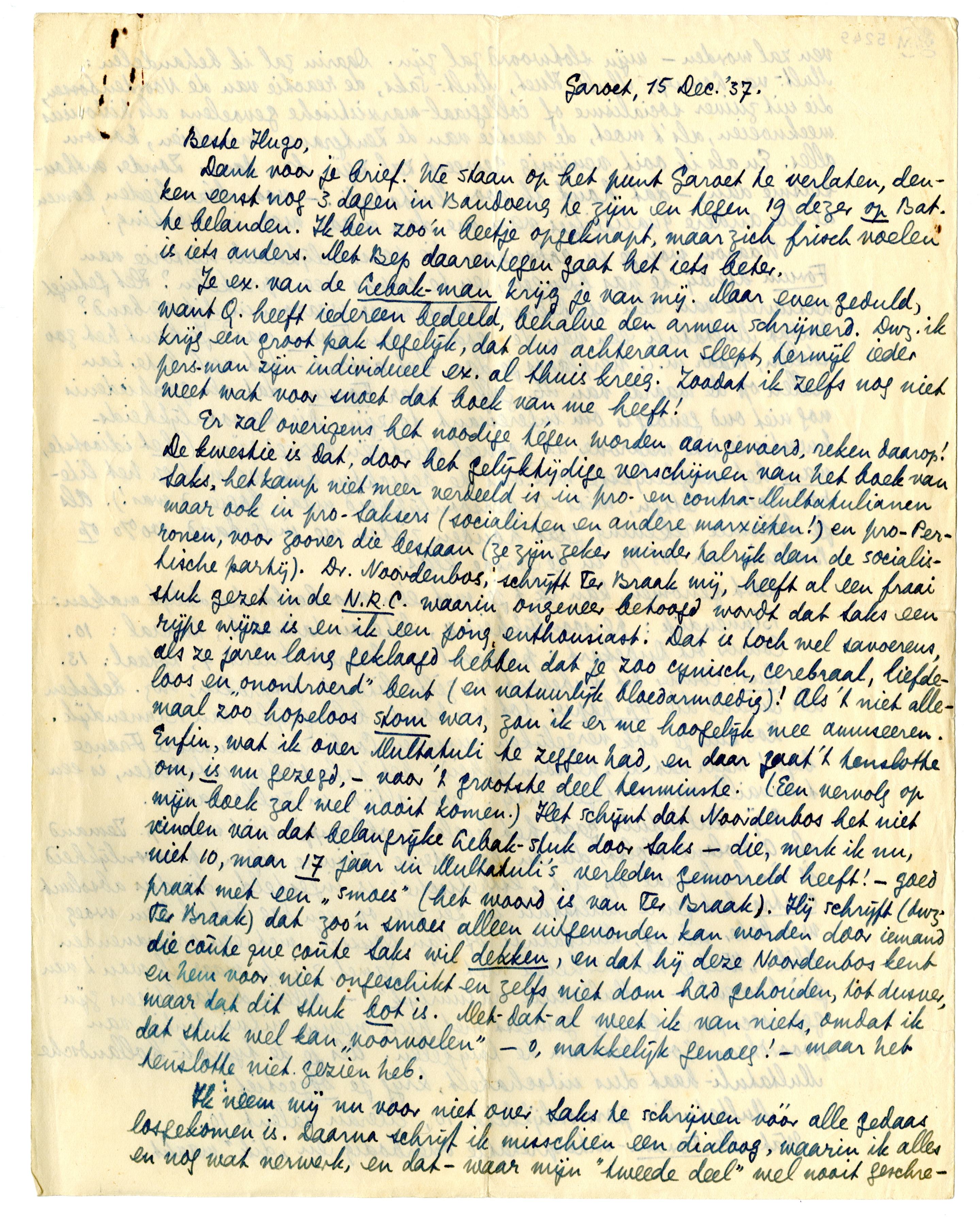 Ik schrijf je dit expres omdat ik je liever niet je zie uitputten in studieuze overbodigheden, die door den onverschilligen Bataviaan tòch niet begrepen worden, en door de anderen (als daar zijn: Ritman en van der Ven,5137 Binnerts en Jansen en nog 6 anderen) meesmuilend zullen worden becommenteerd. Waarom lees je niet doodgewoon dat boek van me - al of niet met dat van Saks ernaast - en schrijft dan gewoon voor de vuist weg hoe jij erop reageert? Je hebt niets noodig dan Dr. Hugo Samkalden te zijn, dwz. zooals je reilt-en-zijlt iemand met 10 × meer ‘cultuur’ en ‘finesse’ en 10 × minder hollandsche plompverlorenheid, dan nagenoeg alle ambtenaren en aanverwante belangstellenden in Indië die niet, literair gesproken, ‘van het vak’ zijn. Je stuk zal beter uitvallen, èn voor jou èn voor iedereen (ook voor den ‘gewonen’ lezer), als je alle sociologische, ambtenaarlijke, politieke, historische, literaire preoccupatie vergeet, en jezelf gewoon aanvaardt als een voldoend magazijn van al die heerlijkheid en dus als iemand die ‘zoo maar’ een opinie heeft.