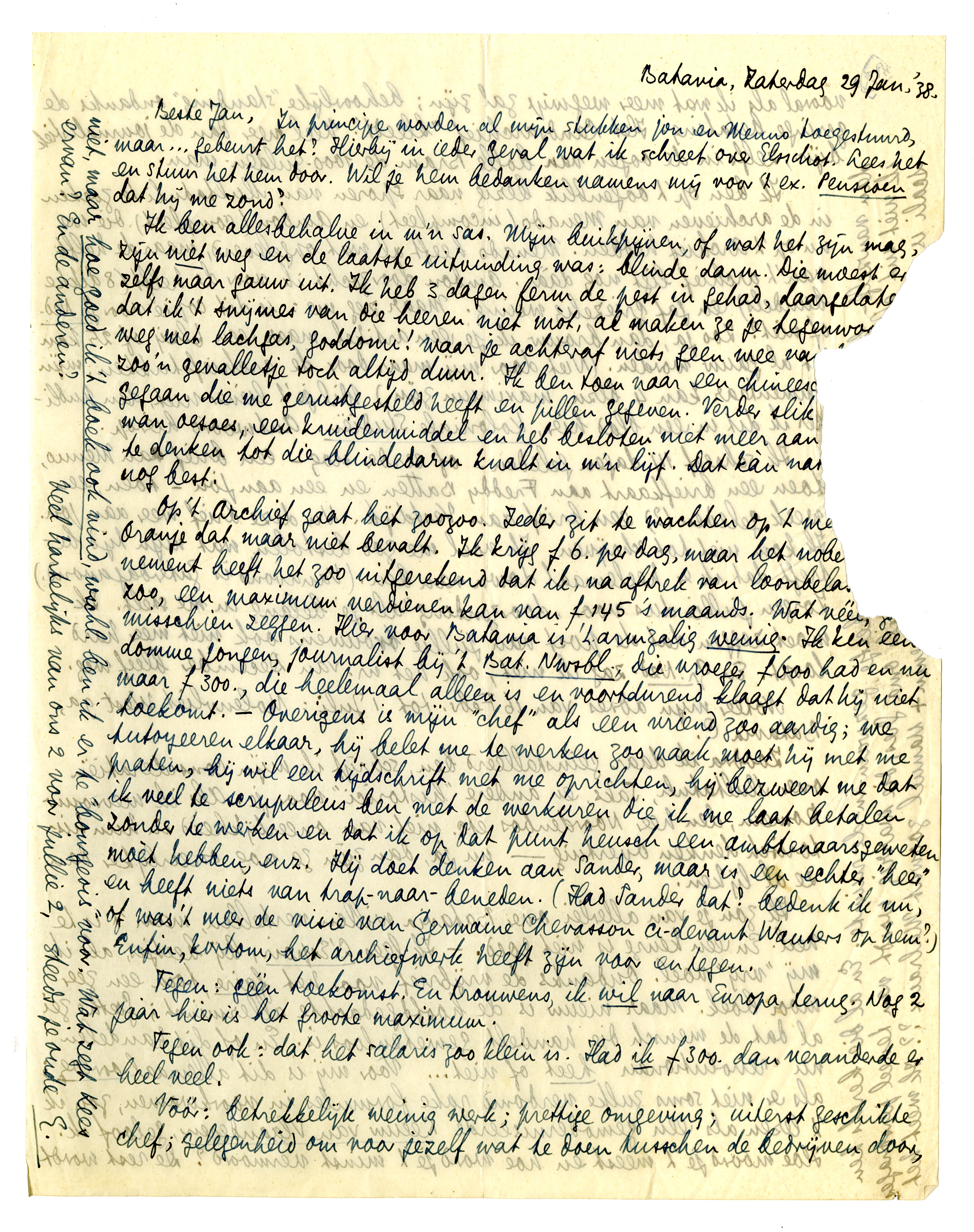 Op 't Archief gaat het zoozoo. Ieder zit te wachten op 't meOranje dat maar niet bevalt.5207 Ik krijg f 6. per dag, maar het nobenement heeft het zoo uitgerekend dat ik, na aftrek van loonbelazoo, een maximum verdienen kan van f 145 's maands. Wat véél,misschien zeggen. Hier voor Batavia is 't armzalig weinig. Ik ken een domme jongen, journalist bij 't Bat. Nwsbl., die vroeger f 600 had en nu maar f 300., die heelemaal alleen is en voortdurend klaagt dat hij niet toekomt. - Overigens is mijn ‘chef’ als een vriend zoo aardig; we tutoyeeren elkaar, hij belet me te werken zoo vaak moet hij met me praten, hij wil een tijdschrift met me oprichten, hij bezweert me dat ik veel te scrupuleus ben met de werkuren die ik me laat betalen zonder te werken en dat ik op dat punt heusch een ambtenaarsgeweten moèt hebben, enz. Hij doet denken aan Sander, maar is een echter ‘heer’ en heeft niets van trap-naar-beneden. (Had Sander dat? bedenk ik nu, of was 't meer de visie van Germaine Chevasson ci-devant Wauters5208 op hem?) Enfin, kortom, het archiefwerk heeft zijn voor en tegen.