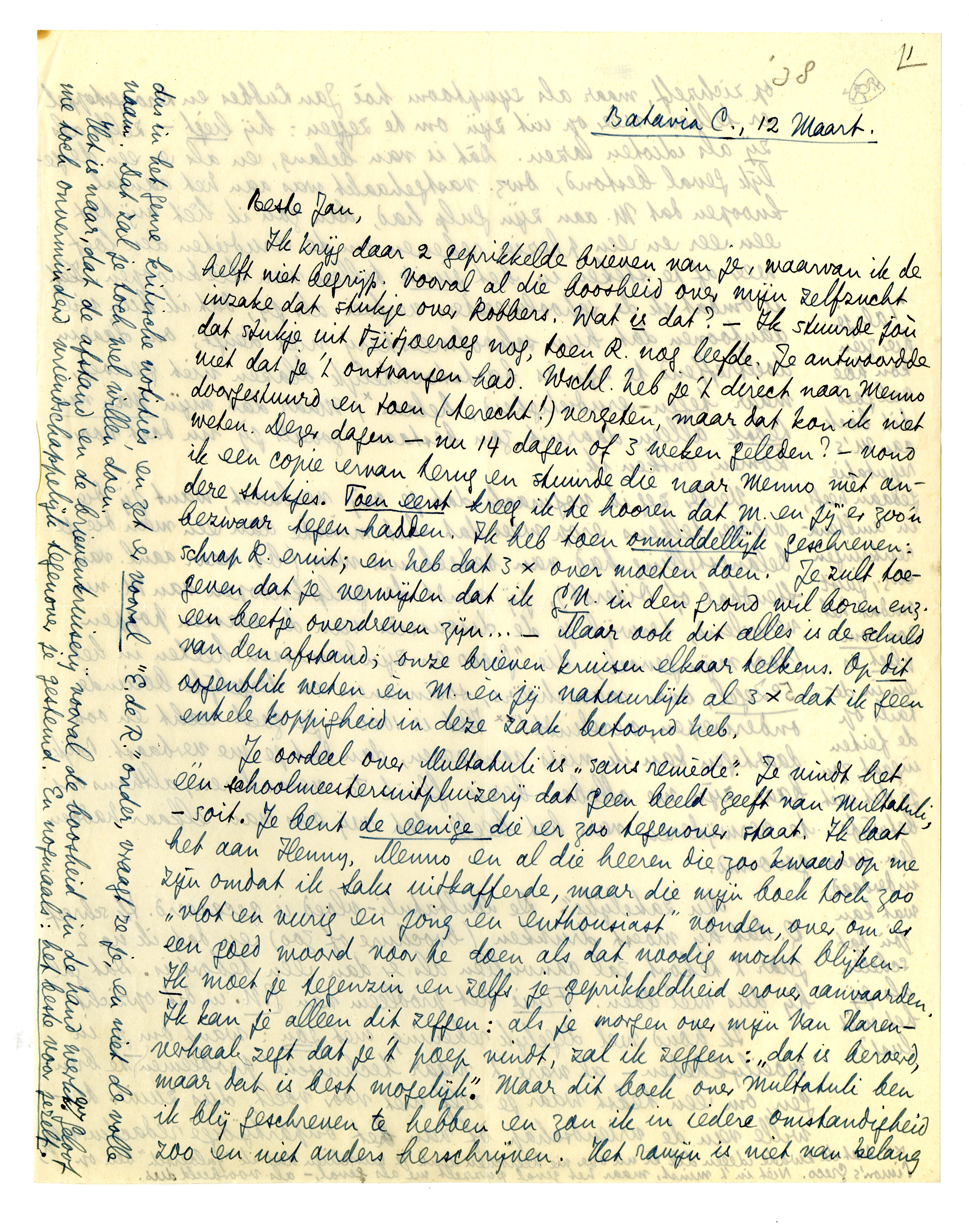Ik krijg daar 2 geprikkelde brieven van je, waarvan ik de helft niet begrijp. Vooral al die boosheid over mijn zelfzucht inzake dat stukje over Robbers. Wat is dat? - Ik stuurde joù dat stukje uit Tjitjoeroeg nog, toen R. nog leefde. Je antwoordde niet dat je 't ontvangen had. Wschl. heb je 't direct naar Menno doorgestuurd en toen (terecht!) vergeten, maar dat kon ik niet weten. Dezer dagen - nu 14 dagen of 3 weken geleden? - vond ik een copie ervan terug en stuurde die naar Menno mèt andere stukjes. Toen eerst kreeg ik te hooren dat M. en jij er zoo'n bezwaar tegen hadden. Ik heb toen onmiddellijk geschreven: schrap R. eruit; en heb dat 3 × over moeten doen. Je zult toegeven dat je verwijten dat ik G.N. in den grond wil boren enz. een beetje overdreven zijn... - Maar ook dit alles is de schuld van den afstand; onze brieven kruisen elkaar telkens. Op dit oogenblik weten èn M. èn jij natuurlijk al 3 × dat ik geen enkele koppigheid in deze zaak betoond heb.