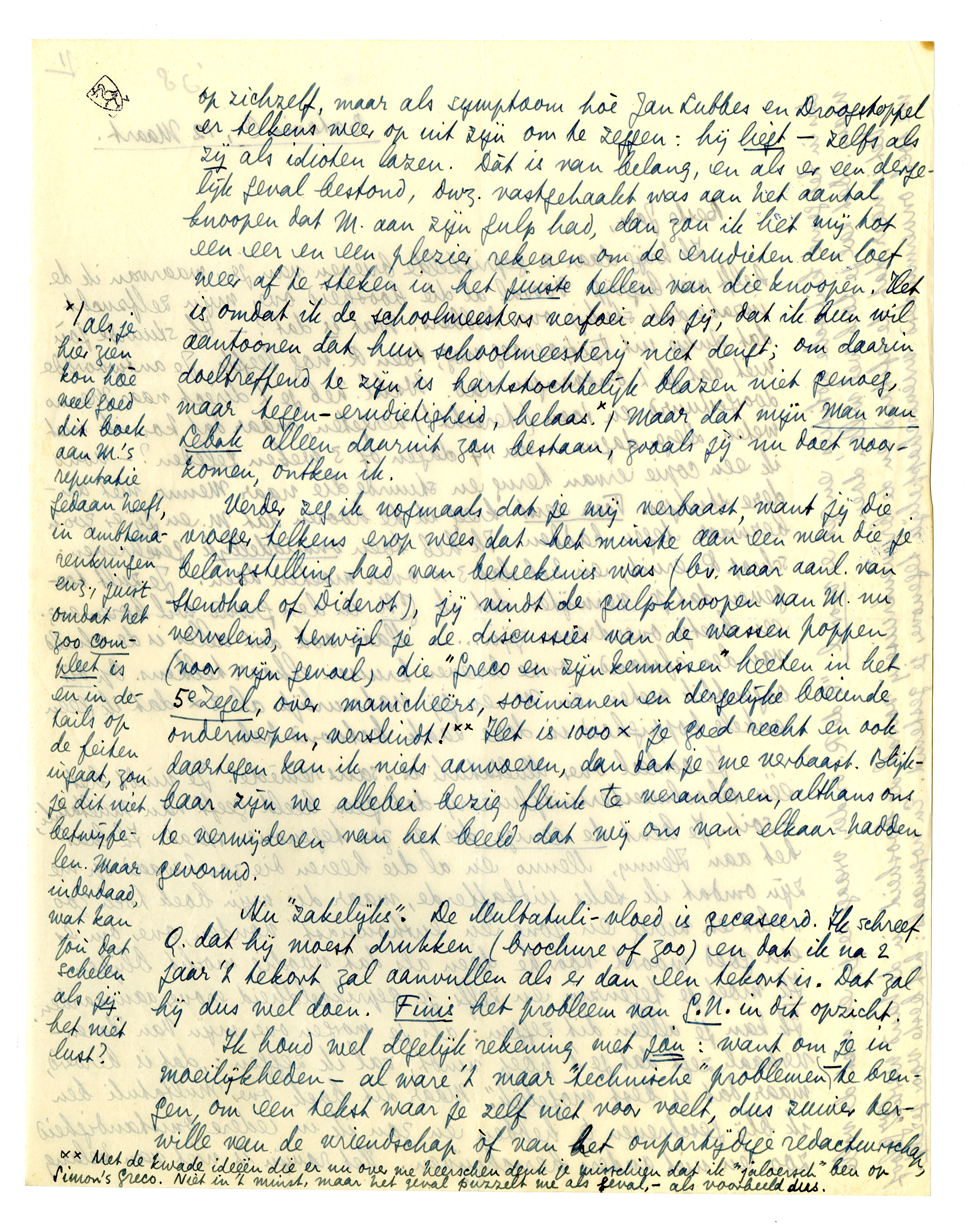 Verder zeg ik nogmaals dat je mij verbaast, want jij die vroeger telkens erop wees dat het minste aan een man die je belangstelling had van beteekenis was (bv. naar aanl. van Stendhal of Diderot), jij vindt de gulpknoopen van M. nu vervelend, terwijl je de discussies van de wassen poppen (voor mijn gevoel) die ‘Greco en zijn kennissen’ heeten in het 5e Zegel, over manicheërs, socinianen en derge-lijke boeiende onderwerpen verslindt!* Het is 1000 × je goed recht en ook daartegen kan ik niets aanvoeren, dan dat je me verbaast. Blijkbaar zijn we allebei bezig flink te veranderen, althans ons te verwijderen van het beeld dat wij ons van elkaar hadden gevormd.