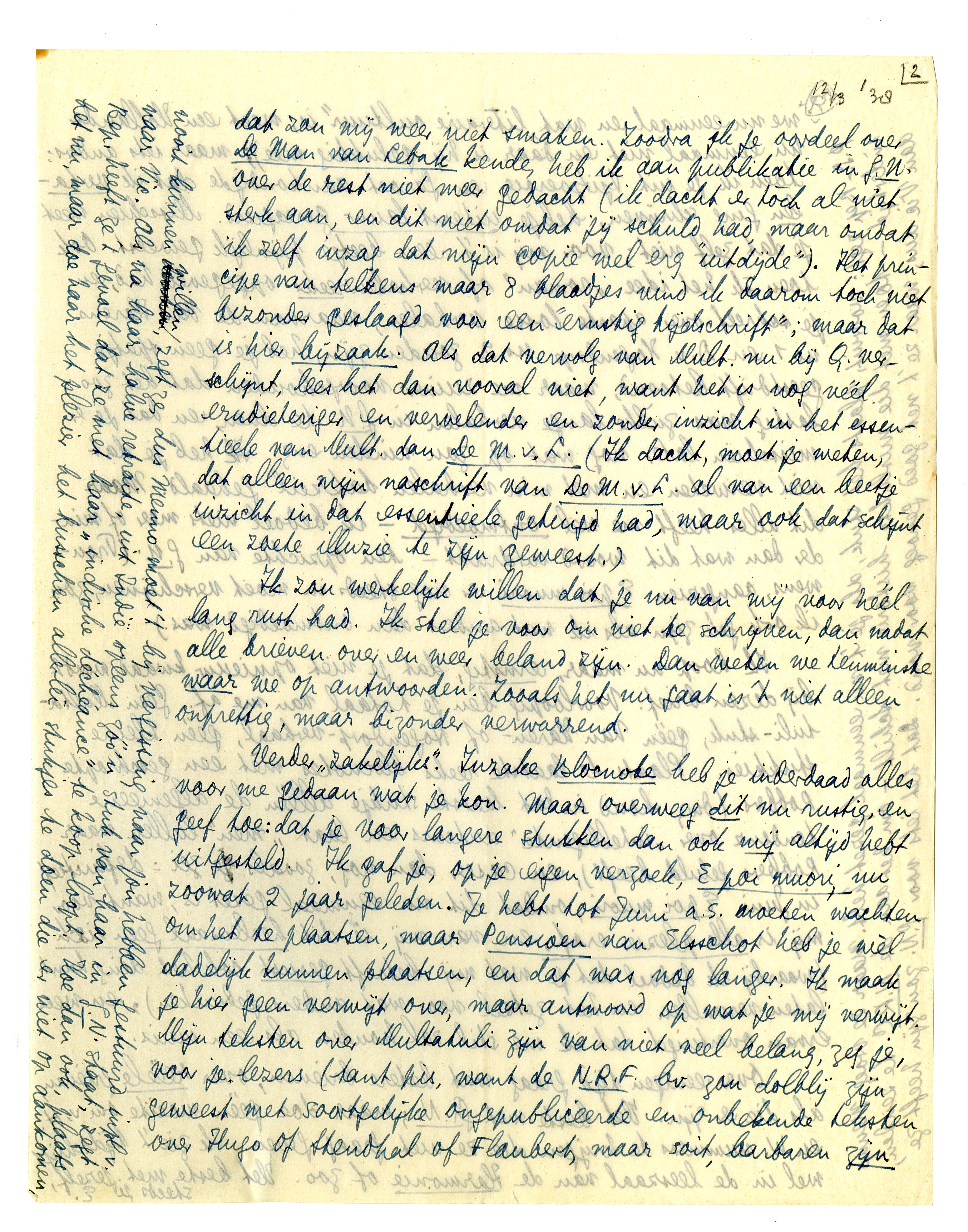 P.S. - Bep zegt: vooruit, plaats het stuk, als je 't nu eenmaal gezet hebt. Maar ze vroeg Menno indertijd - toen met die mislukte historie met Schilt5261 - om het aan de N.R.C. te zenden, aan Vic dus, waar ze 't net goed genoeg voor vond. Dat het iets voor G.N. zou zijn heeft ze nooit kunnen willen, zegt ze, dus Menno moet 't mij bij vergissing naar jou hebben gestuurd inpl. v. naar Vic. Als na haar halve retraite, uit Indië opeens zóó'n stuk van haar in G.N. staat, zegt Bep, heeft ze 't gevoel dat ze met haar ‘indische déchéance’ te koop loopt. Hoe dan ook, plaats het nu, maar doe haar het plezier het tusschen allerlei stukjes te doen die er niet op aankomen, dus in het genre kritische notities, en zet er vooral ‘E. de R.’ onder, vraagt ze je, en niet de volle naam. Dat zal je toch wel willen doen.
