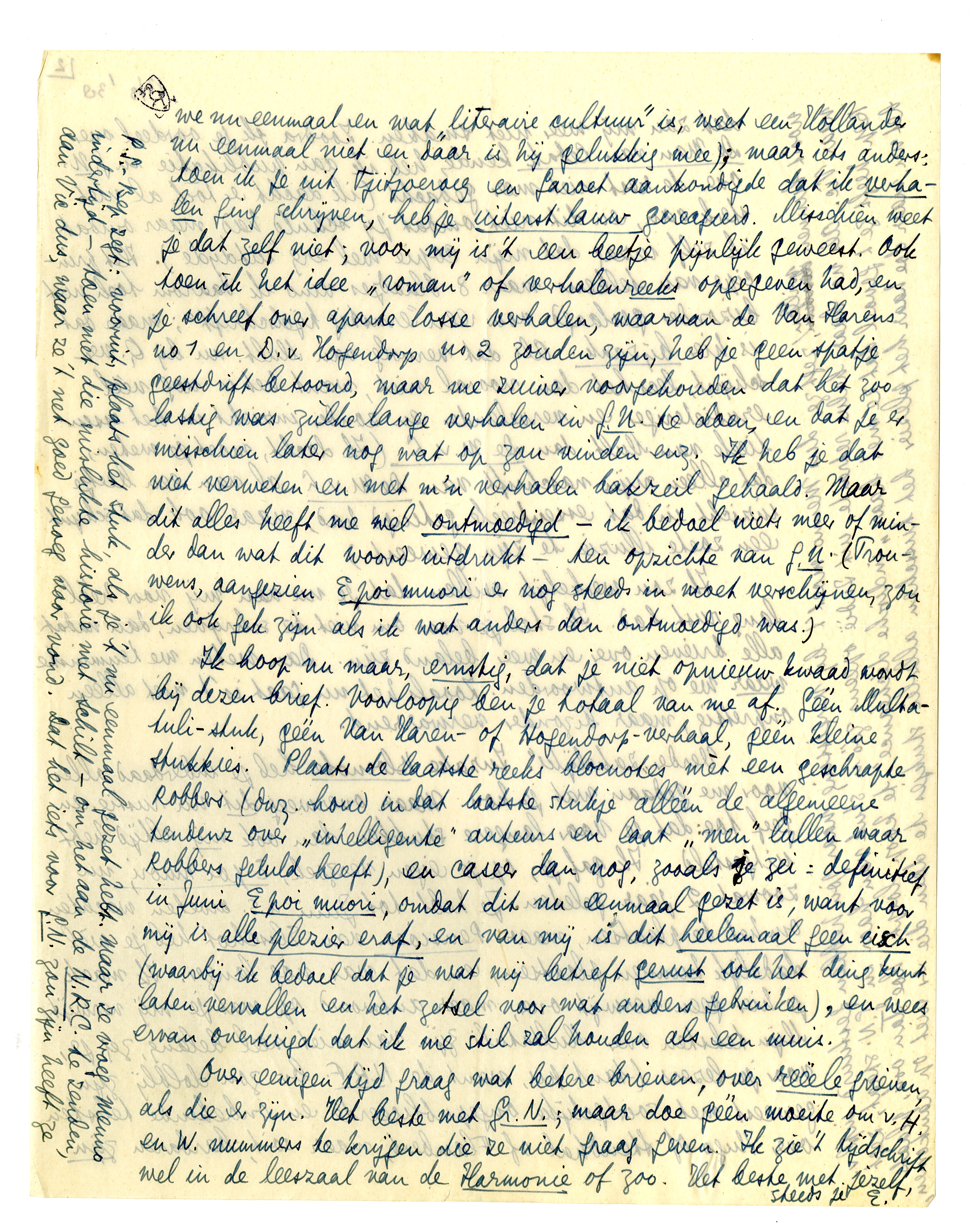 Ik hoop nu maar, ernstig, dat je niet opnieuw kwaad wordt bij dezen brief. Voorloopig ben je totaal van me af. Géén Multatulistuk, géén Van Haren- of Hogendorp-verhaal, géén kleine stukkies. Plaats de laatste reeks blocnotes mèt een geschrapte Robbers (dwz. houd in dat laatste stukje alléén de algemene tendenz over ‘intelligente’ auteurs en laat ‘men’ lullen waar Robbers geluld heeft), en caseer dan nog, zooals je zei: definitief in Juni E poi muori, omdat dit nu eenmaal gezet is, want voor mij is alle plezier eraf, en van mij is dit heelemaal geen eisch (waarbij ik bedoel dat je wat mij betreft gerust ook het ding kunt laten vervallen en het zetsel voor wat anders gebruiken), en wees ervan overtuigd dat ik me stil zal houden als een muis.