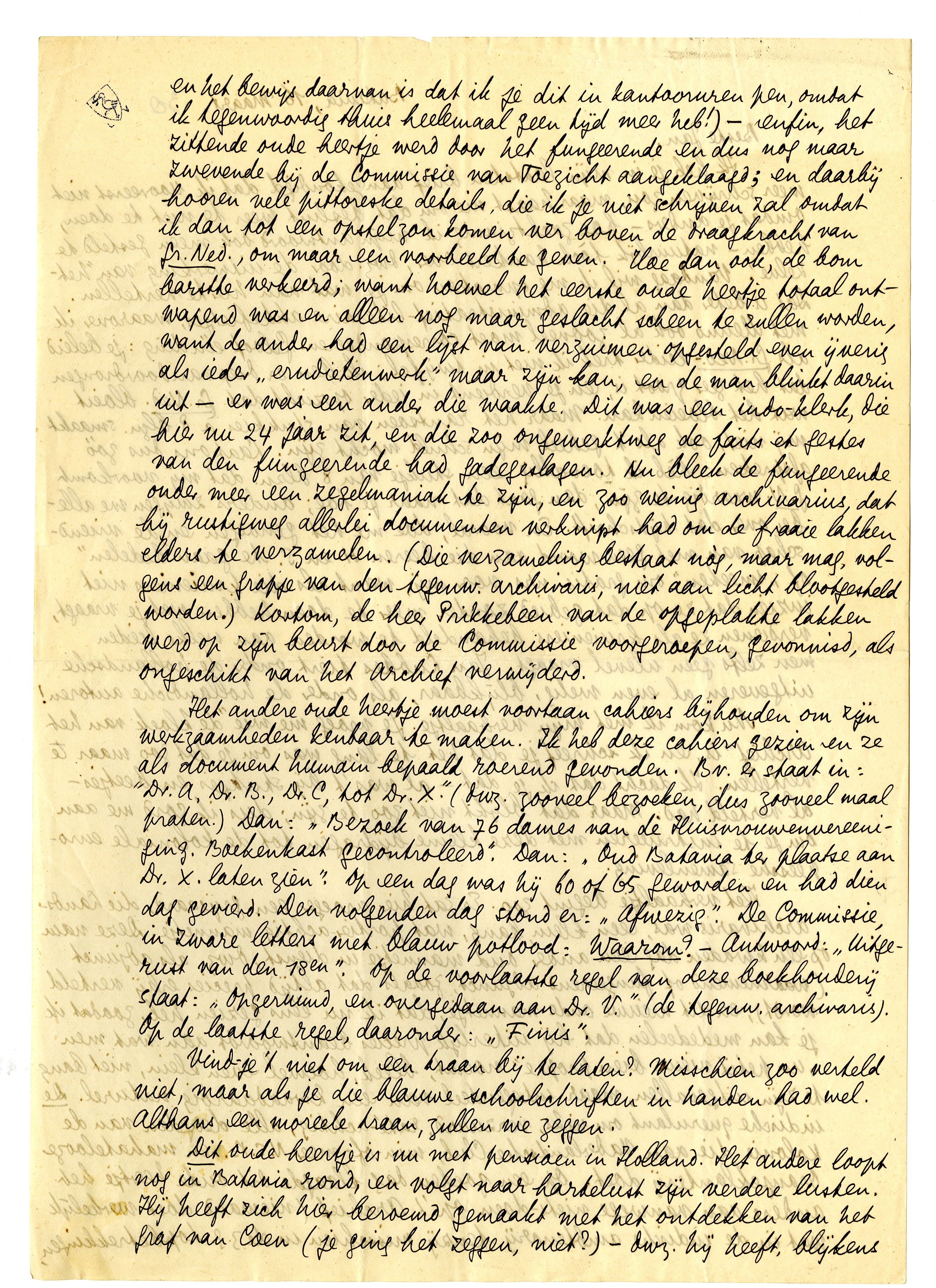 Het andere oude heertje moest voortaan cahiers bijhouden om zijn werkzaamheden kenbaar te maken. Ik heb deze cahiers gezien en ze als document humain bepaald roerend gevonden. Bv. er staat in: ‘Dr. A, Dr. B., Dr. C, tot Dr. X.’ (dwz. zooveel bezoeken, dus zooveel maal praten) Dan: ‘Bezoek van 76 dames van de Huisvrouwen-vereeniging. Boekenkast gecontroleerd’. Dan: ‘Oud Batavia ter plaatse aan Dr. X. laten zien’. Op een dag was hij 60 of 65 geworden en had dien dag gevierd. Den volgenden dag stond er: ‘Afwezig’. De Commissie, in zware letters met blauw potlood: Waarom? - Antwoord: ‘Uitgerust van den 18en’. Op de voorlaatste regel van deze boekhouderij staat: ‘opgeruimd, en overgedaan aan Dr. V.’ (de tegenw. archivaris). Op de laatste regel, daaronder: ‘Finis’.