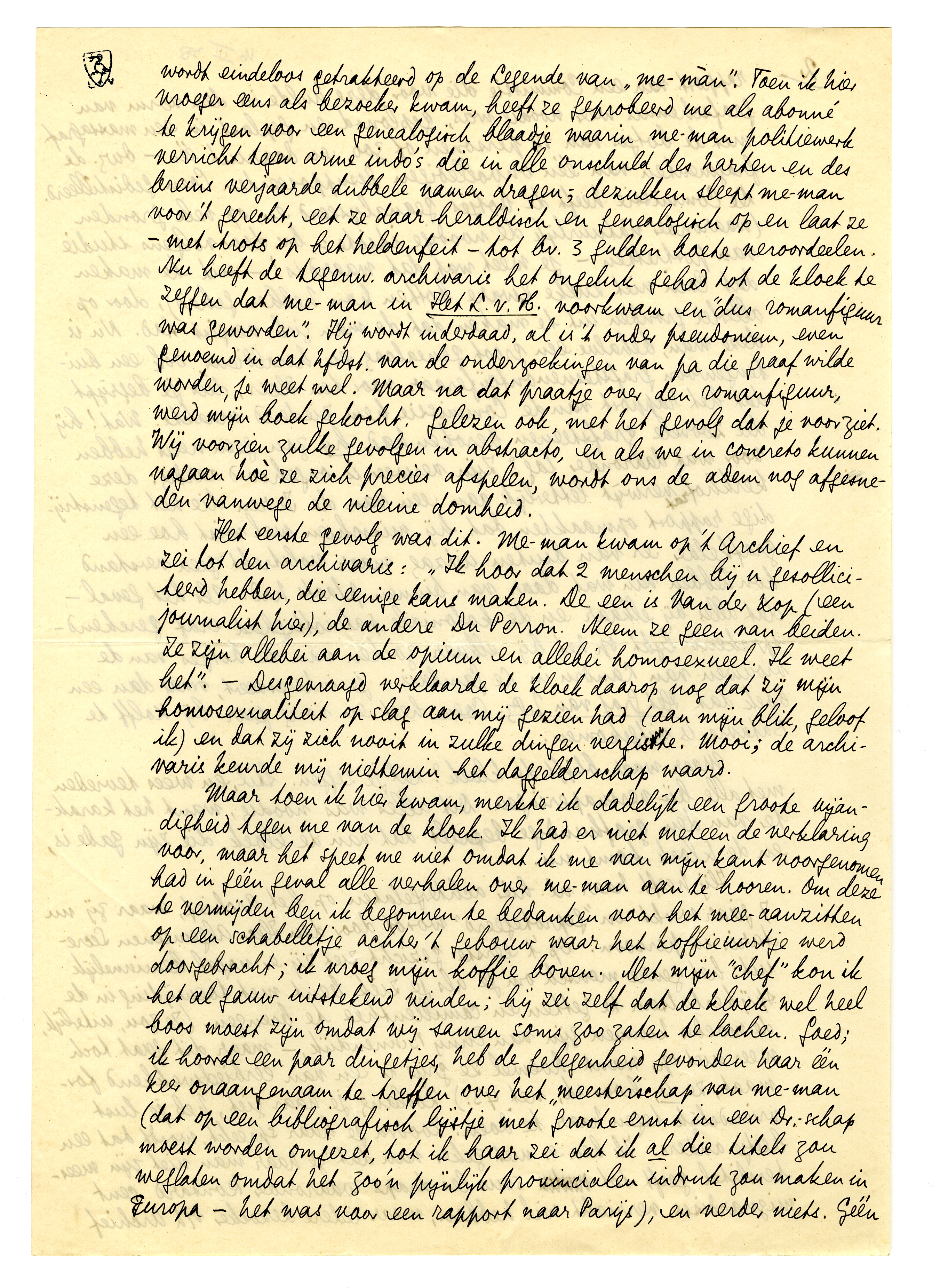 Het eerste gevolg was dit. Me-man kwam op 't Archief en zei tot den archivaris; ‘Ik hoor dat 2 menschen bij u gesolliciteerd hebben, die eenige kans maken. De een is Van der Kop (een journalist hier), de andere Du Perron. Neem ze geen van beiden. Ze zijn allebei aan de opium en allebei homosexueel. Ik weet het’. - Desgevraagd verklaarde de kloek daarop nog dat zij mijn homosexualiteit op slag aan mij gezien had (aan mijn blik, geloof ik) en dat zij zich nooit in zulke dingen vergiste. Mooi; de archivaris keurde mij niettemin het daggelderschap waard.