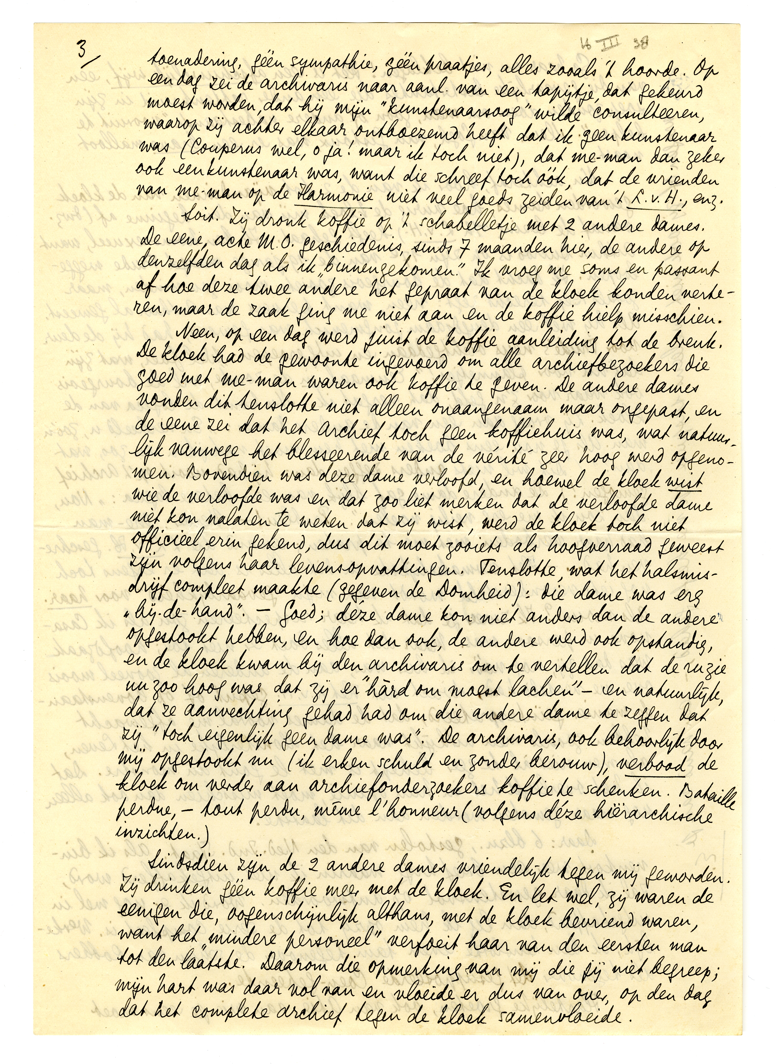 Maar toen ik hier kwam, merkte ik dadelijk een groote vijandigheid tegen me van de kloek. Ik had er niet meteen de verklaring voor, maar het speet me niet omdat ik me van mijn kant voorgenomen had in géén geval alle verhalen over me-man aan te hooren. Om deze te vermijden ben ik begonnen te bedanken voor het meeaanzitten op een schabelletje achter 't gebouw waar het koffieuurtje werd doorgebracht; ik vroeg mijn koffie boven. Met mijn ‘chef’ kon ik het al gauw uitstekend vinden; hij zei zelf dat de kloek wel heel boos moest zijn omdat wij samen soms zoo zaten te lachen. Goed; ik hoorde een paar dingetjes, heb de gelegenheid gevonden haar één keer onaangenaam te treffen over het ‘meester’schap van me-man (dat op een bibliografisch lijstje met groote ernst in een Dr.-schap moest worden omgezet, tot ik haar zei dat ik al die titels zou weglaten omdat het zoo'n pijnlijk provincialen indruk zou maken in Europa - het was voor een rapport naar Parijs), en verder niets. Géén toenadering, géén sympathie, géén praatjes, alles zooals 't hoorde. Op een dag zei de archivaris naar aanl. van een tapijtje, dat gekeurd moest worden, dat hij mijn ‘kunstenaarsoog’ wilde consulteeren, waarop zij achter elkaar ontboezemd heeft dat ik geen kunstenaar was (Couperus wel, o ja! maar ik toch niet), dat me-man dan zeker ook een kunstenaar was, want die schreef toch óók, dat de vrienden van me-man op de Harmonie niet veel goeds zeiden van 't L.v.H., enz.