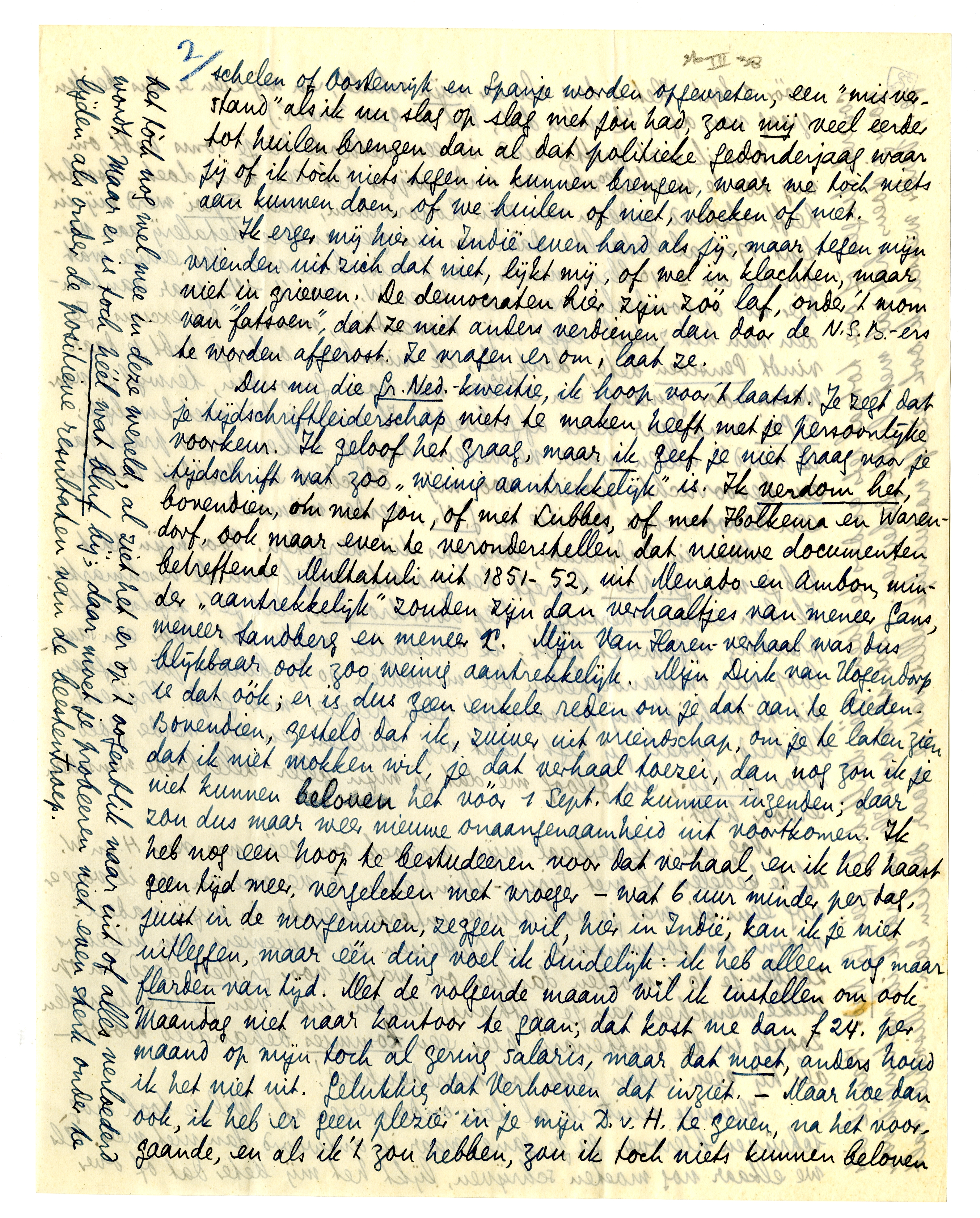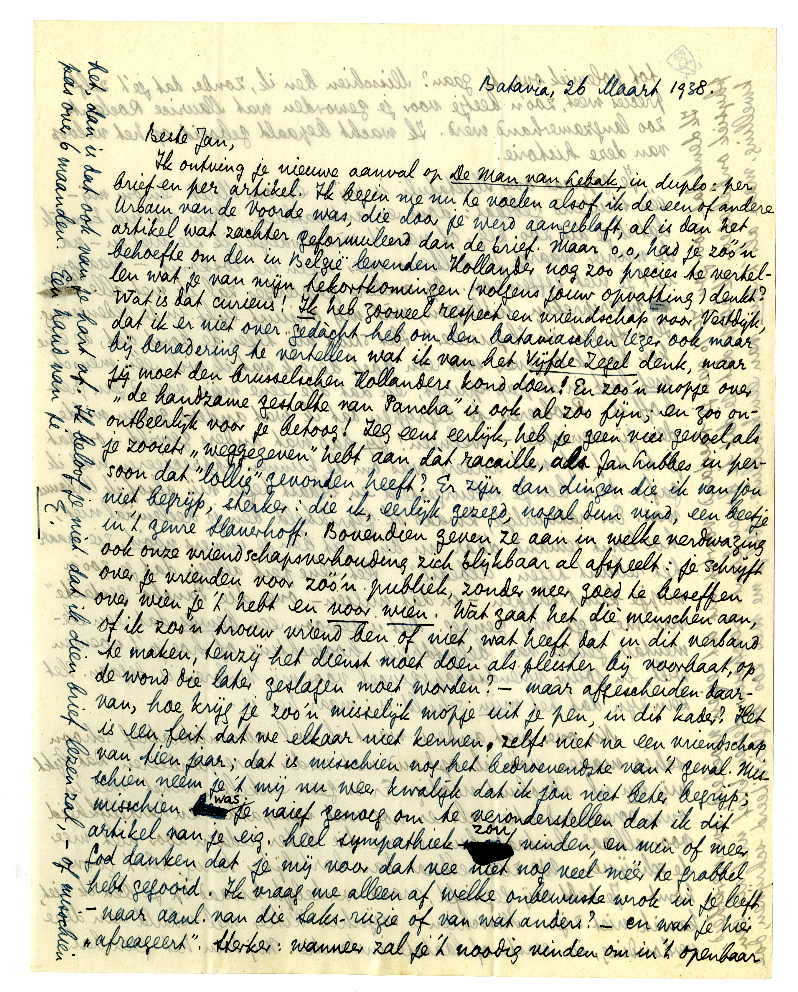 Dus nu die Gr. Ned.-kwestie, ik hoop voor het 't laatst. Je zegt dat je tijdschriftenleiderschap niets te maken heeft met je persoonlijke voorkeur. Ik geloof het graag, maar ik geef je niet graag voor je tijdschrift wat zoo ‘weinig aantrekkelijk’ is. Ik verdom het, bovendien, om met jou, of met Lubbes, of met Holkema en Warendorf ook maar even te veronderstellen dat nieuwe documenten betreffende Multatuli uit 1851-52, uit Menado en Ambon, minder ‘aantrekkelijk’ zouden zijn dan verhaaltjes van meneer Gans, meneer Sandberg en meneer X. Mijn Van Haren-verhaal was dus blijkbaar ook zoo weinig aantrekkelijk. Mijn Dirk van Hogendorp is dat óók; er is dus geen enkele reden om je dat aan te bieden. Bovendien, gesteld dat ik, zuiver uit vriendschap, om je te laten zien dat ik niet mokken wil, je dat verhaal toezei, dan nog zou ik je niet kunnen beloven het vóór 1 Sept. te kunnen inzenden; daar zou dus maar weer nieuwe onaangenaamdheid uit voortkomen. Ik heb nog een hoop te bestudeeren voor dat verhaal, en ik heb haast geen tijd meer, vergeleken met vroeger - wat 6 uur minder per dag, juist in de morgenuren, zeggen wil, hier in Indië, kan ik je niet uitleggen, maar één ding voel ik duidelijk: ik heb alleen nog maar flarden van tijd. Met de volgende maand wil ik instellen om ook Maandag niet naar kantoor te gaan; dat kost me dan f 24. per maand op mijn toch al gering salaris, maar dat moet, anders houd ik het niet uit. Gelukkig dat Verhoeven dat inziet. - Maar hoe dan ook, ik heb er geen plezier in je mijn D.v.H. te geven, na het voorgaande, en als ik 't zou hebben, zou ik toch niets kunnen beloven vóór 1 Sept. Het is dus alweer mijn schuld, en wij zien er dus beiden graag van af. (Ik méén dit; het is geen ‘sneer’.)