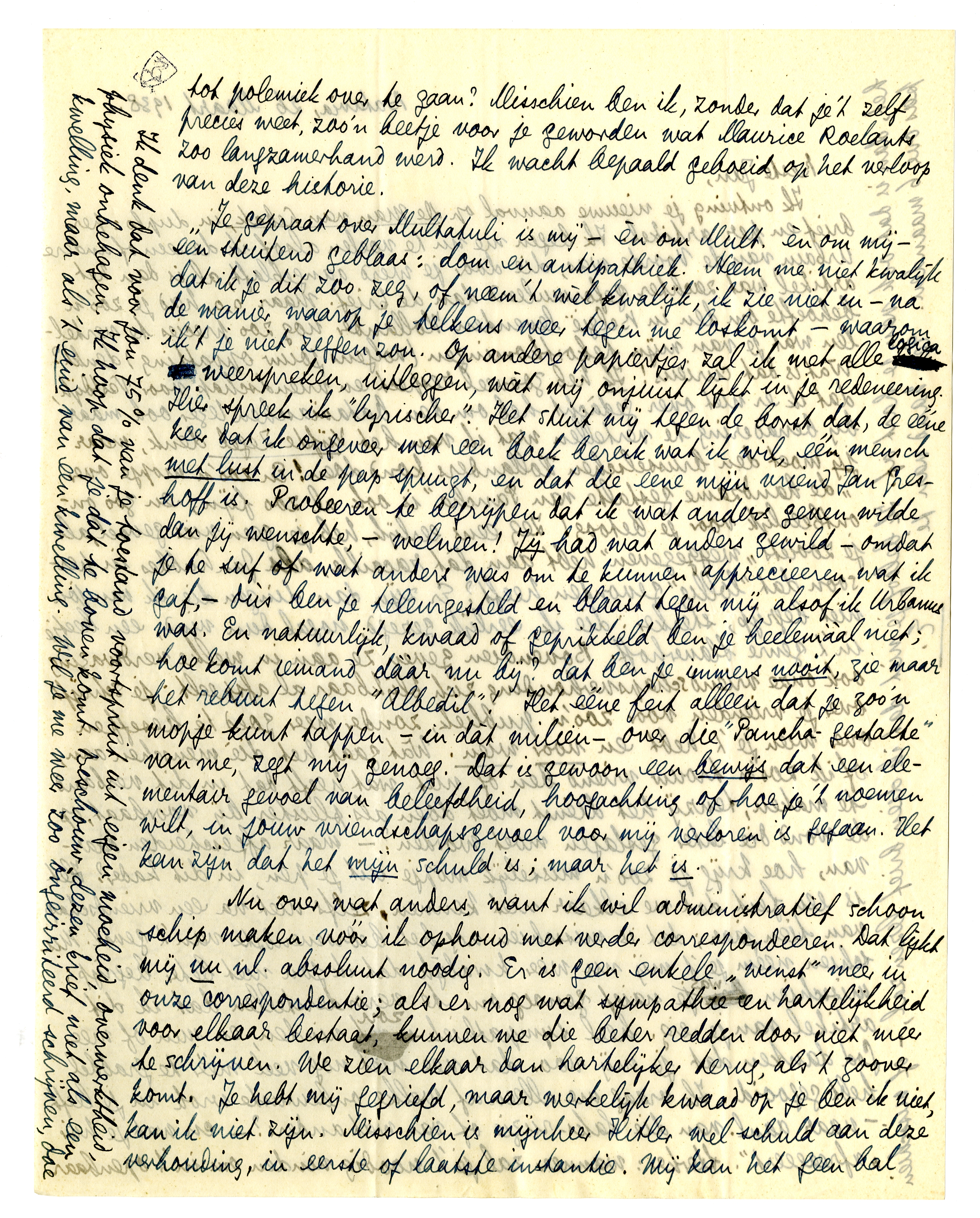 Ik ontving je nieuwe aanval op De Man van Lebak in duplo: per brief en per artikel.5293 Ik begin me nu te voelen alsof ik de een of andere Urbain van de Voorde was, die door je werd aangeblaft, al is dan het artikel wat zachter geformuleerd dan de brief Maar o, o, had je zóó'n behoefte om den in België levenden Hollander nog zoo precies te vertellen wat je van mijn tekortkomingen (volgens jouw opvatting) denkt? Wat is dat curieus! Ik heb zooveel respect en vriendschap voor Vestdijk, dat ik er niet over gedàcht heb om den bataviaschen lezer ook maar bij benadering te vertellen wat ik van het Vijfde Zegel denk, maar jij moet den brusselschen Hollanders kond doen! En zoo'n mopje over ‘de handzame gestalte van Pancha’ is ook al zoo fijn; en zoo onontbeerlijk voor je betoog!5294 Zeg eens eerlijk, heb je geen vies gevoel, als je zooiets ‘weggegeven’ hebt aan dàt racaille, als Jan Lubbes in persoon dat ‘lollig’ gevonden heeft? Er zijn dan dingen die ik van jou niet begrijp, sterker: die ik, eerlijk gezegd, nogal dun vind, een beetje in 't genre Slauerhoff. Bovendien geven ze aan in welke verdwazing ook onze vriendschapsverhouding zich blijkbaar al afspeelt: je schrijft over je vrienden voor zóó'n publiek, zonder meer goed te beseffen over wien je 't hebt en voor wien. Wat gaat het diè menschen aan, of ik zoo'n trouw vriend ben of niet, wat heeft dat in dit verband te maken, tenzij het dienst moet doen als pleister bij voorbaat, op de wond die later geslagen moet worden?5295 - maar afgescheiden daarvan, hoe krijg je zoo'n misselijk mopje uit je pen, in dit kader? Het is een feit dat we elkaar niet kennen, zelfs niet na een vriendschap van tien jaar; dat is misschien nog het bedroevendste van 't geval. Misschien neem je 't mij nu weer kwalijk dat ik jou niet beter begrijp; misschien was je naief genoeg om te veronderstellen dat ik dit artikel van je eig. heel sympathiek zou vinden, en min of meer God danken dat je mij voor dat vee niet nog veel méér te grabbel hebt gegooid. Ik vraag me alleen af welke onbewuste wrok in je leeft - naar aanl. van die Saks-ruzie of van wat anders? - en wat je hier ‘afreageert’. Sterker: wanneer zal je 't noodig vinden om in 't openbaar tot polemiek over te gaan? Misschien ben ik, zonder dat je 't zelf precies weet, zoo'n beetje voor je geworden wat Maurice Roelants zoo langzamerhand werd. Ik wacht bepaald geboeid op het verloop van deze historie.
