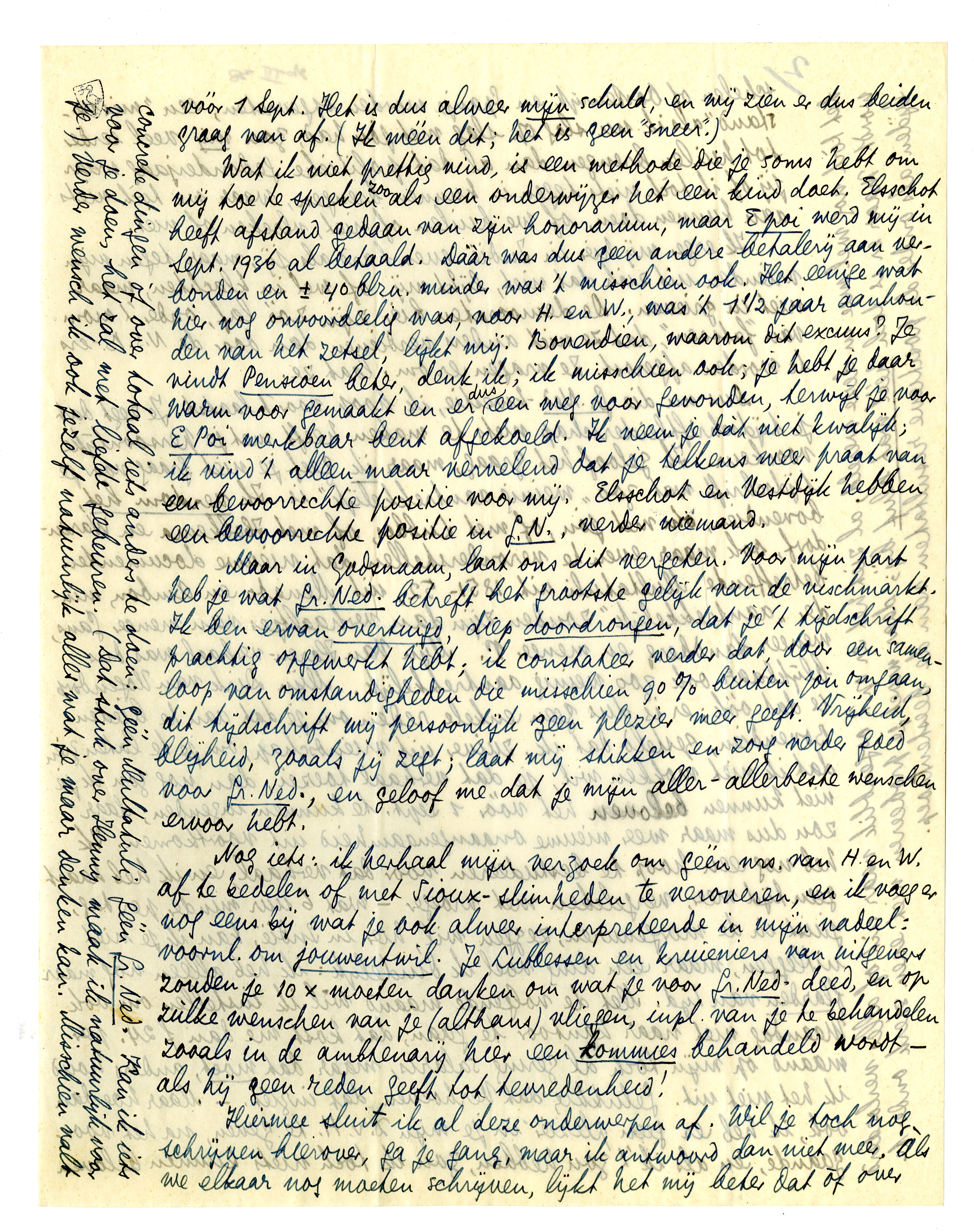Wat ik niet prettig vind, is een methode die je soms hebt om mij toe te spreken zooals een onderwijzer het een kind doet. Elsschot heeft afstand gedaan van zijn honorarium, maar E poi werd mij in Sept. 1936 al betaald. Dáár was dus geen andere betalerij aan verbonden en ± 40 blzn. minder was 't misschien ook. Het eenige wat hier nog onvoordeelig was, voor H. en W., was 't 1½ jaar aanhouden van het zetsel, lijkt mij. Bovendien, waarom dit excuus? Je vind Pensioen beter, denk ik; ik misschien ook;je hebt je daar warm voor gemaakt en er dus een weg voor gevonden, terwijl je voor E poi merkbaar bent afgekoeld. Ik neem je dàt niet kwalijk; ik vind 't alleen maar vervelend dat je telkens weer praat van een bevoorrechte positie voor mij. Elsschot en Vestdijk hebben een bevoorrechte positie in G.N., verder niemand.