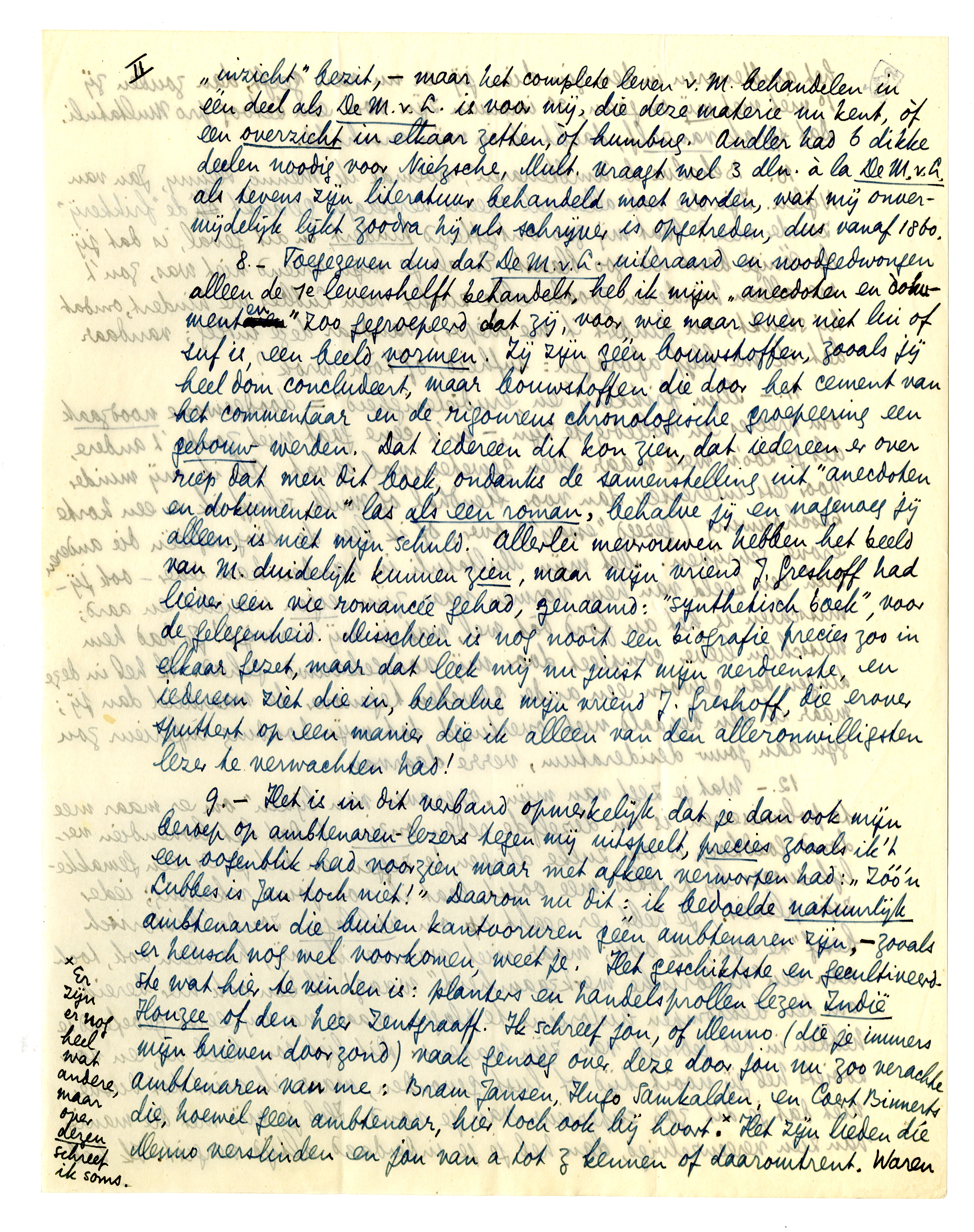 | 7. | - Gegeven dat ik dus een beeld van M. wilde geven en toch zooveel mogelijk naar de ‘bronnen’ teruggaan, - zoodat ook de lezer de ‘oudste berichten’ zelf controleeren kan, - en niet navertellend en interpreteerend tegelijk, kòn ik niet beter doen dan ik deed. Mijn commentaar is mijn interpretatie, maar ik wil die alleen geven met de documenten op tafel. Dat jij dit niet apprecieert, vind ik lui en dom. Rest dus je bezwaar dat het leven nu niet compleet is. Dat is de schuld van Querido, niet mijn schuld. Ik ben bereid de rest van Mult.'s leven te behandelen, even compleet, en precies op deze zelfde manier op zijn later leven toepassend wat ik aan ‘inzicht’ bezit, - maar het complete leven v.M. behandelen in één deel als De M.v.L. is voor mij, die deze materie nu kent, òf een overzicht in elkaar zetten, òf humbug. Andler had 6 dikke deelen noodig voor Nietzsche, Mult. vraagt wel 3 dln. à la De M.v.L. als tevens zijn literatuur behandeld moet worden, wat mij onvermijdelijk lijkt zoodra hij als schrijver is opgetreden, dus vanaf 1860. |