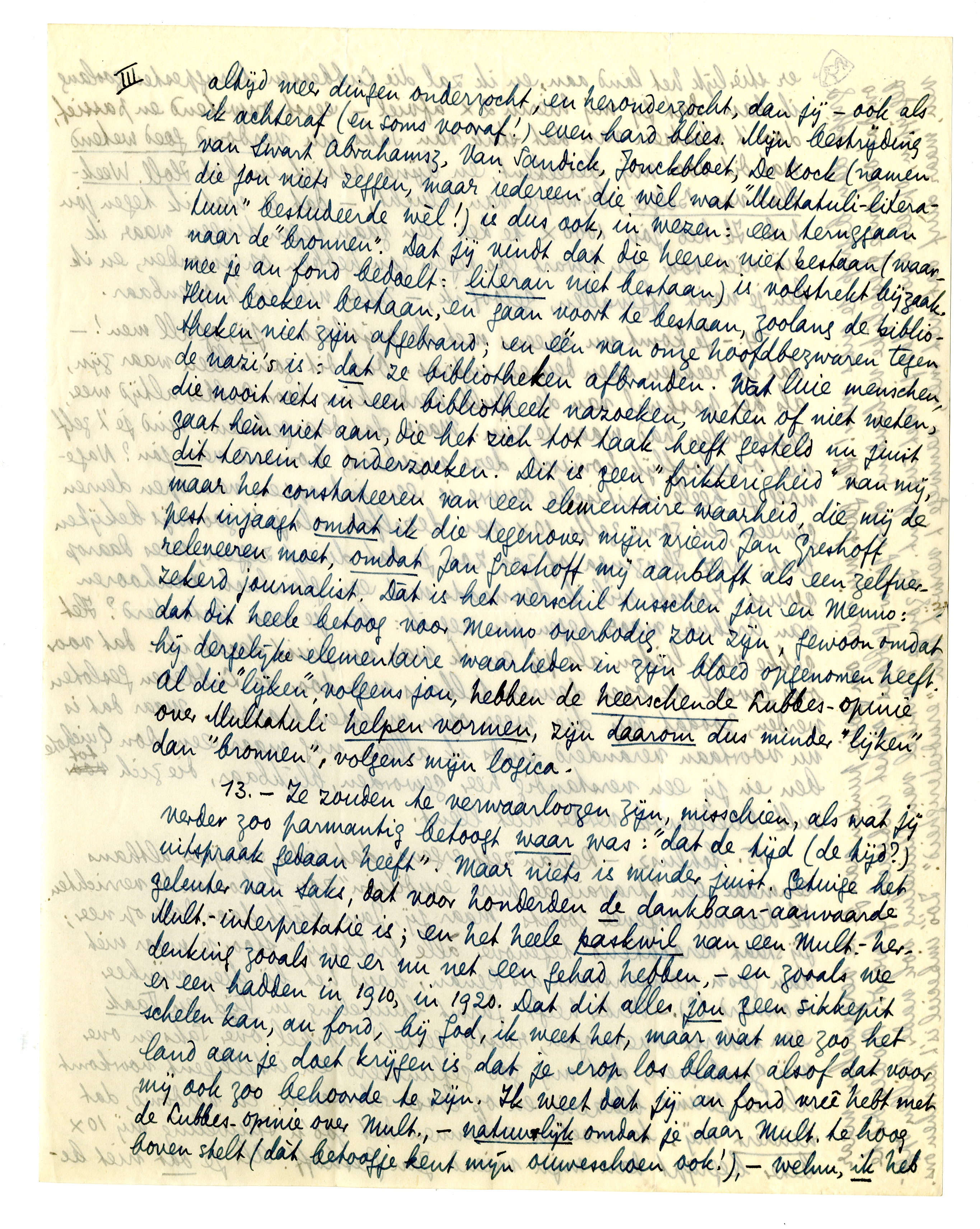 | 12. | - Wat je zegt van mijn ‘opgraven van lijken’ om er maar mee te polemiseeren, is om dezelfde reden onzin.5302 (Dat het bovendien verdomd goedkoop is om zulke dingen te zeggen en dat je er een gemakkelijk succes bij Lubbes mee oogst, laat ik voor jouw rekening; ieder zijn plezier.) Je hebt er recht op om volslagen zonder ‘historisch besef’ te zijn; ik ook; maar niet wanneer ik mij, hoe dan ook, toch aan een ‘historische werkzaamheid’ waag! Ik ben ook hier bereid om den bekrompen historicus te plagen, maar na mij eerst geoefend te hebben in het gebruik van zijn wapens. Dit ligt jou heel ver, en voor zooiets heb jij nooit tijd of lust gevonden, maar ik wist tot dusver niet dat je dit zoo superieur van je vond. Heb je mij met die manier van zien vereenzelvigd, dan heb je je inderdaad altijd vergist. Ik heb altijd meer dingen onderzocht, en heronderzocht, dan jij - ook als ik achteraf (en soms vooraf!) even hard blies. Mijn bestrijding van Swart Abrahamsz, Van Sandick, Jonckbloet, De Kock (namen die jou niets zeggen, maar iedereen die wèl wat ‘Multatuli-literatuur’ bestudeerde wèl!) is dus ook, in wezen: een teruggaan naar de ‘bronnen’. Dat jij vindt dat die heeren niet bestaan (waarmee je au fond bedoelt: literair niet bestaan) is volstrekt bijzaak. Hun boeken bestaan, en gaan voort te bestaan, zoolang de bibliotheken niet zijn afgebrand; en één van onze hoofdbezwaren tegen de nazi's is: dat ze bibliotheken afbranden. Wat luie menschen, die nooit iets in een bibliotheek nazoeken, weten of niet weten, gaat hèm niet aan, die het zich tot taak heeft gesteld nu juist dit terrein te onderzoeken. Dit is geen ‘frikkerigheid’ van mij, maar het constateeren van een elementaire waarheid, die mij de pest injaagt omdat ik die tegenover mijn vriend Jan Greshoff releveeren moet, omdat Jan Greshoff mij aanblaft als een zelfverzekerd journalist. Dàt is het verschil tusschen jou en Menno: dat dit heele betoog voor Menno overbodig zou zijn, gewoon omdat hij dergelijke elementaire waarheden in zijn bloed opgenomen heeft. Al die ‘lijken’, volgens jou, hebben de heerschende Lubbes-opinie over Multatuli helpen vormen, zijn daarom dus minder ‘lijken’ dan ‘bronnen’, volgens mijn logica. |
