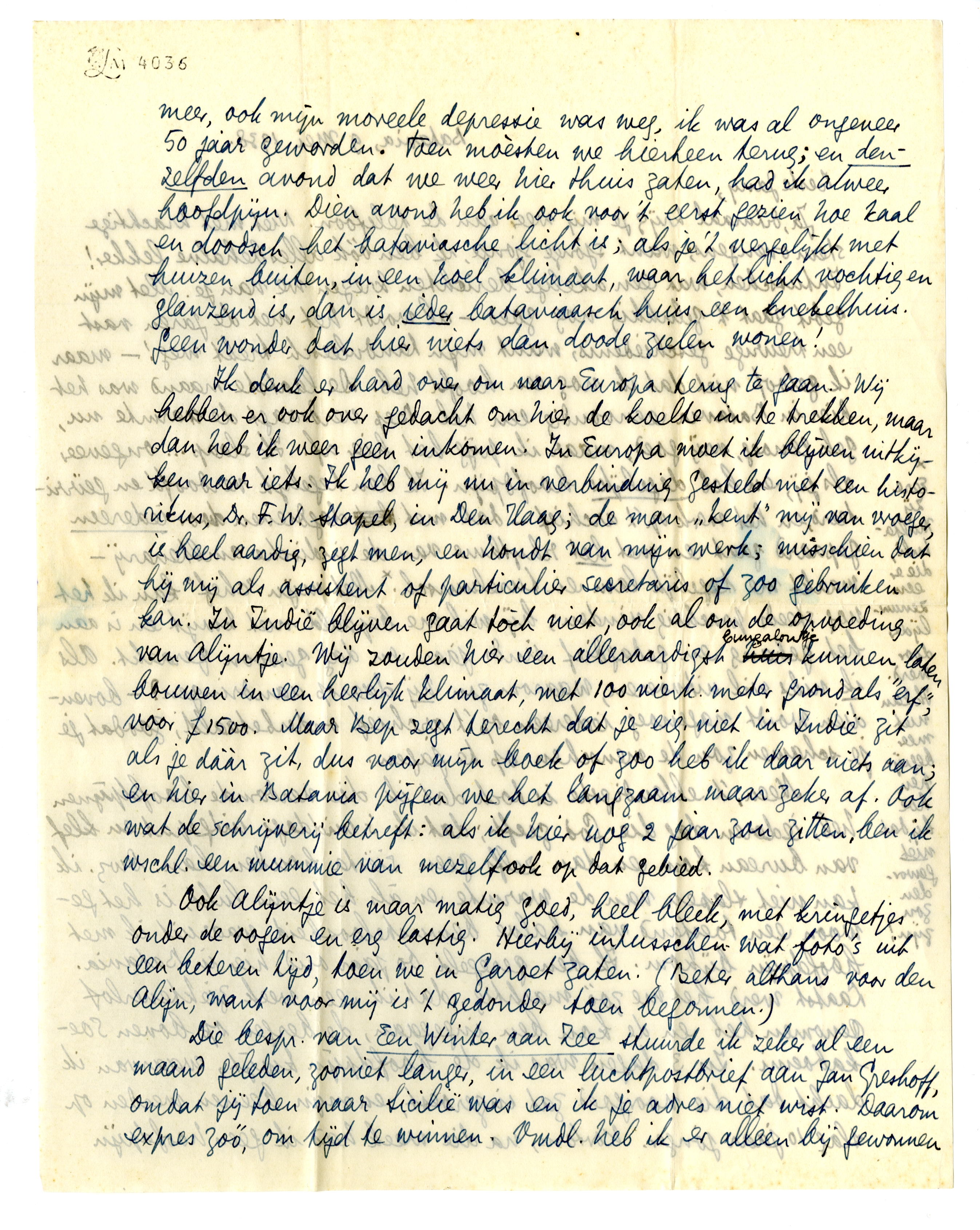Ik denk er hard over om naar Europa terug te gaan. Wij hebben er ook over gedacht om hier de koelte in te trekken, maar dan heb ik weer geen inkomen. In Europa moet ik blijven uitkijken naar iets. Ik heb mij nu in verbinding gesteld met een historikus, Dr. F.W. Stapel, in Den Haag; de man ‘kent’ mij van vroeger, is heel aardig, zegt men, en houdt van mijn werk; misschien dat hij mij als assistent of particulier secretaris of zoo gebruiken kan. In Indië blijven gaat tòch niet, ook al om de opvoeding van Alijntje. Wij zouden hier een alleraardigst bungalowtje kunnen laten bouwen in een heerlijk klimaat, met 100 vierk. meter grond als ‘erf’, voor f1500. Maar Bep zegt terecht dat je eig. niet in Indië zit als je dààr zit, dus voor mijn boek of zoo heb ik daar niets aan; en hier in Batavia pijgen we het langzaam maar zeker af. Ook wat de schrijverij betreft: als ik hier nog 2 jaar zou zitten, ben ik wschl. een mummie van mezelf ook op dat gebied.
