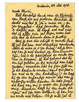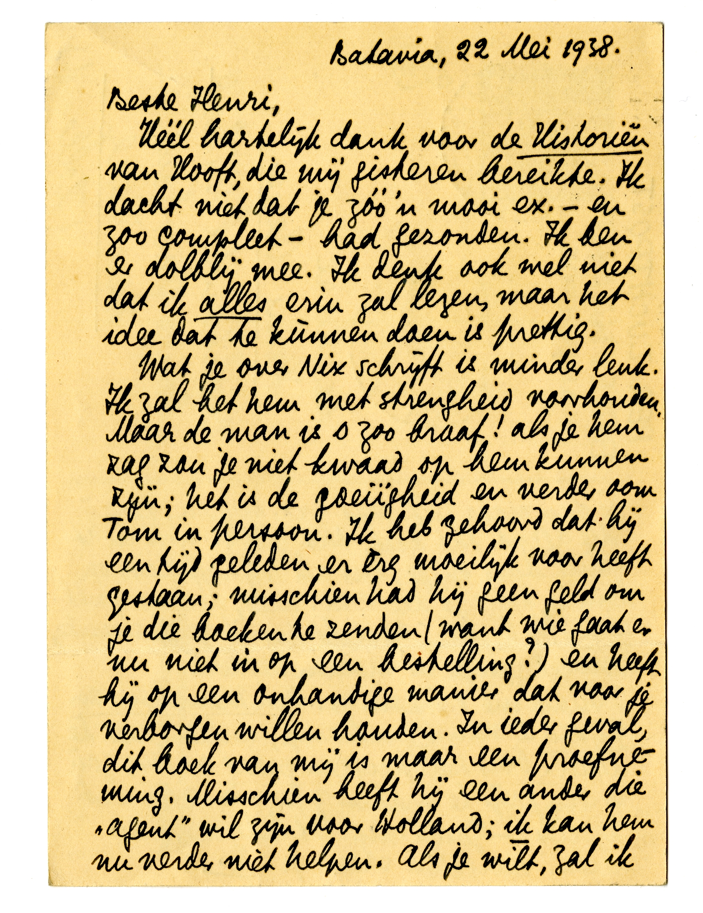 Wat je over Nix schrijft is minder leuk. Ik zal het hem met strengheid voorhouden. Maar de man is o zoo braaf! Als je hem zag zou je niet kwaad op hem kunnen zijn; het is de goeiïgheid en verder oom Tom in persoon. Ik heb gehoord dat hij een tijd geleden er èrg moeilijk voor heeft gestaan; misschien had hij geen geld om je die boeken te zenden (want wie gaat er nu niet in op een bestelling?) en heeft hij op een onhandige manier dat voor je verborgen willen houden. In ieder geval, dit boek van mij is maar een proefneming. Misschien heeft hij een ander die ‘agent’ wil zijn voor Holland; ik kan hem nu niet verder helpen. Als je wilt, zal ik je dan maar zelf wat exx. sturen, tenzij die agent dat doet. Nix zelf is niet in 't minst boos op je, dus als Nijhoff boos op hem is, krijg je die exx. niet, anders wschl. met alle liefde. Gesteld dat ik ze je stuurde, hoeveel zou je er moeten hebben?