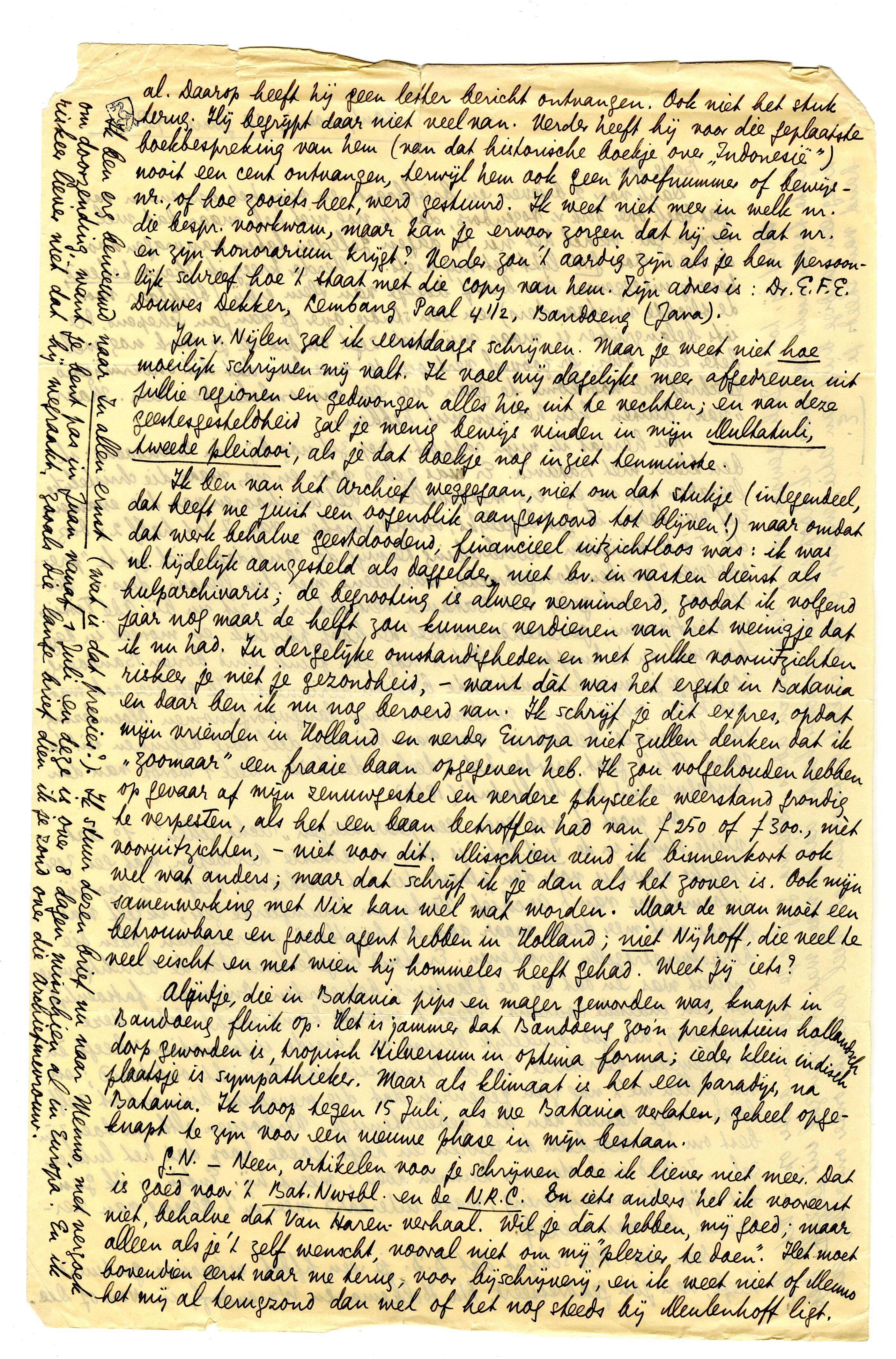 Ik ben van het Archief weggegaan, niet om dat stukje (integen-deel, dat heeft me juist een oogenblik aangespoord tot blijven!) maar omdat dat werk behalve geestdoodend, financieel uitzichtloos was: ik was nl. tijdelijk aangesteld als daggelder, niet bv. in vasten dienst als hulparchivaris; de begrooting is alweer verminderd, zoodat ik volgend jaar nog maar de helft zou kunnen verdienen van het weinigje dat ik nu had. In dergelijke omstandigheden en met zulke vooruitzichten riskeer je niet je gezondheid, - want dàt was het ergste in Batavia en daar ben ik nu nog beroerd van. Ik schrijf je dit expres, opdat mijn vrienden in Holland en verder Europa niet zullen denken dat ik ‘zoomaar’ een fraaie baan opgegeven heb. Ik zou volgehouden hebben op gevaar af mijn zenuwgestel en verdere physieke weerstand grondig te verpesten, als het een baan betroffen had van f 250 of f 300., mèt vooruitzichten, - niet voor dit. Misschien vind ik binnenkort ook wel wat anders; maar dat schrijf ik je dan als het zoover is. Ook mijn samenwerking met Nix kan wel wat worden. Maar de man moèt een betrouwbare en goede agent hebben in Holland; niet Nijhoff, die veel te veel eischt en met wien hij hommeles heeft gehad. Weet jij iets?