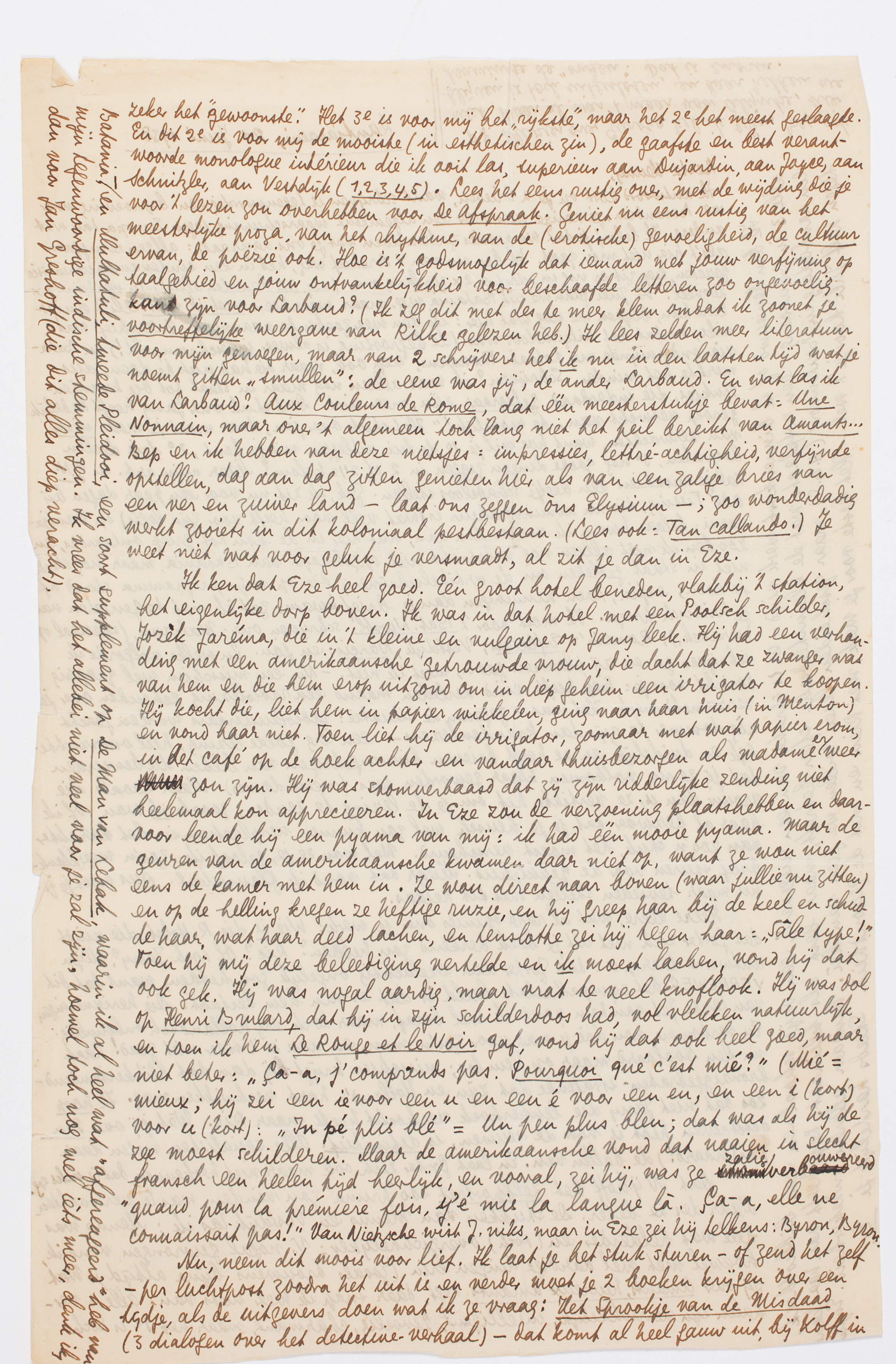 Dat Nijhoff het Zelfportret zoo ‘prima’ zou vinden, was te verwachten. Maar des te beter. De stukken van Menno en Vestdijk las ik5430; Menno was heel wat helderder en (tòch) overzichtelijker; V. nogal gewrongen, vond ik, hoewel met wel aardige dingen erin (zooals trouwens bijna altijd). Wat jij over Amants, heureux amants zegt, daar snap ik weer niets van. Alle 3 verhalen5431 zijn verrukkelijk, intelligent, gevoelig, charmant, maar het 1e is toch zeker het ‘gewoonste’. Het 3e is voor mij het ‘rijkste’, maar het 2e het meest geslaagde. En dit 2e is voor mij de mooiste (in esthetischen zin), de gaafste en best verantwoorde monologue intérieur die ik ooit las, superieur aan Dujardin, aan Joyce, aan Schnitzler, aan Vestdijk (1, 2, 3, 4, 5).5432 Lees het eens rustig over, met de wijding die je voor 't lezen zou overhebben voor De Afspraak. Geniet nu eens rustig van het meesterlijke proza, van het rhythme, van de (erotische) gevoeligheid, de cultuur ervan, de poëzie ook. Hoe is 't godsmogelijk dat iemand met jouw verfijning op taalgebied en jouw ontvankelijkheid voor beschaafde letteren zoo ongevoelig kan zijn voor Larbaud? (Ik zeg dit met des te meer klem omdat ik zoonet je voortreffelijke weergave van Rilke5433 gelezen heb.) Ik lees zelden meer literatuur voor mijn genoegen, maar van 2 schrijvers heb ik nu in den laatsten tijd wat je noemt zitten ‘smullen’: de eene was jij, de ander Larbaud. En wat las ik van Larbaud? Aux Couleurs de Rome, dat één meesterstukje bevat: Une Nonnain, maar over 't algemeen toch lang niet het peil bereikt van Amants... Bep en ik hebben van deze nietsjes: impressies, lettré-achtigheid, verfijnde opstellen, dag aan dag zitten genieten hier als van een zalige bries van een ver en zuiver land - laat ons zeggen òns Elysium -; zoo wonderdadig werkt zooiets in dit koloniaal pestbestaan. (Lees ook: Tan callando.)5434 Je weet niet wat voor geluk je versmaadt, al zit je dan in Eze.5435