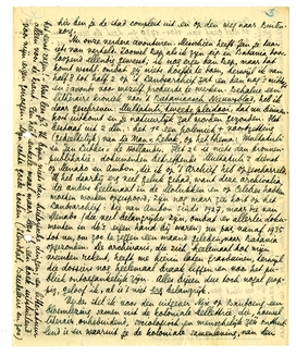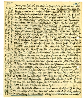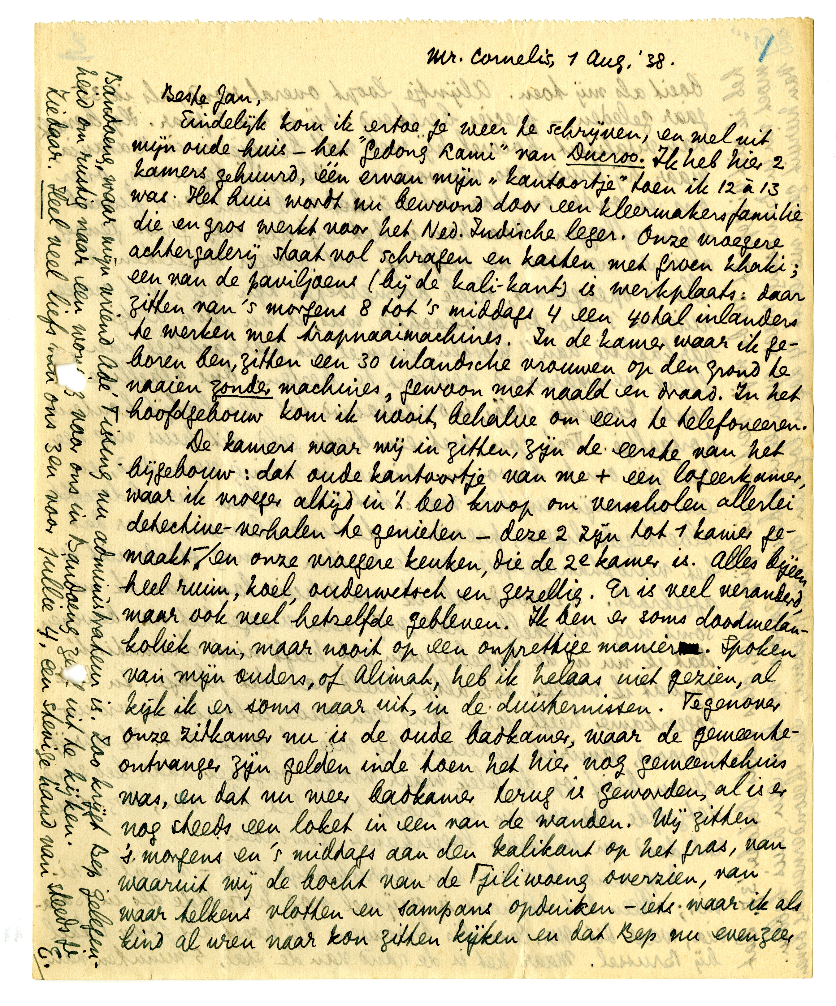Eindelijk kom ik ertoe je weer te schrijven, en wel uit mijn oude huis - het ‘Gedong Lami’ van Ducroo. Ik heb hier 2 kamers gehuurd, één ervan mijn ‘kantoortje’ toen ik 12 à 13 was. Het huis wordt nu bewoond door een kleermakersfamilie die en gros werkt voor het Ned. Indische leger. Onze vroegere achtergalerij staat vol schragen en kasten met groen khaki; een van de paviljoens (bij de kali-kant) is werkplaats: daar zitten van 's morgens 8 tot 's middags 4 een 40 tal inlanders te werken met trapnaaimachines. In de kamer waar ik geboren ben, zitten een 30 inlandsche vrouwen op den grond te naaien zonder machines, gewoon met naald en draad. In het hoofdgebouw kom ik nooit, behalve om eens te telefoneeren.