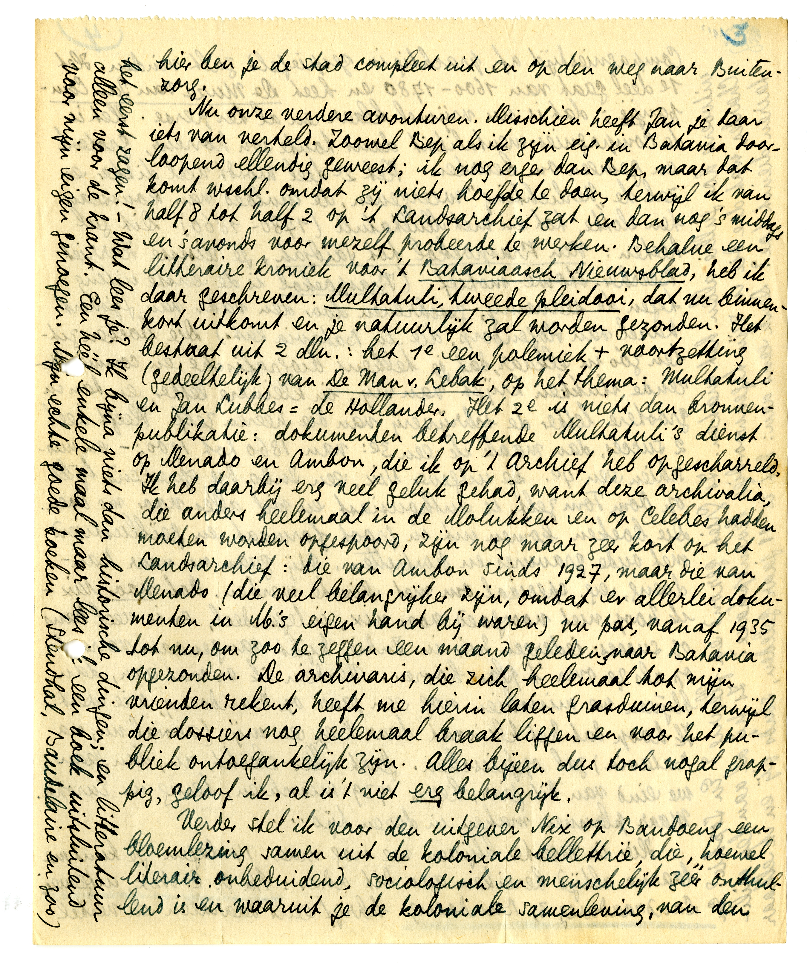 Nu onze verdere avonturen. Misschien heeft Jan je daar iets van verteld. Zoowel Bep als ik zijn eig. in Batavia doorloopend ellendig geweest; ik nog erger dan Bep, maar dat komt wschl. omdat zij niets hoefde te doen, terwijl ik van half 8 tot half 2 op 't Landsarchief zat en dan nog 's middags en 's avonds voor mezelf probeerde te werken. Behalve een litteraire kroniek voor 't Bataviaasch Nieuwsblad, heb ik daar geschreven: Multatuli, tweede pleidooi, dat nu binnenkort uitkomt en je natuurlijk zal worden gezonden. Het bestaat uit 2 dln.: het 1e een polemiek + voortzetting (gedeeltelijk) van De Man v. Lebak, op het thema: Multatuli en Jan Lubbes = de Hollander. Het 2e is niets dan bronnenpublikatie: dokumenten betreffende Multatuli's dienst op Menado en Ambon, die ik op 't Archief heb opgescharreld. Ik heb daarbij erg veel geluk gehad, want deze archivalia, die anders heelemaal in de Molukken en op Celebes hadden moeten worden opgespoord, zijn nog maar zeer kort op het Landsarchief: die van Ambon sinds 1927, maar die van Menado (die veel belangrijker zijn, omdat er allerlei dokumenten in M.'s eigen hand bij waren) nu pas, vanaf 1935 tot nu, om zoo te zeggen een maand geleden, naar Batavia opgezonden. De archivaris, die zich heelemaal tot mijn vrienden rekent, heeft me hierin laten grasduinen, terwijl die dossiers nog heelemaal braak liggen en voor het publiek ontoegankelijk zijn. Alles bijeen dus toch nogal grappig, geloof ik, al is 't niet erg belangrijk.