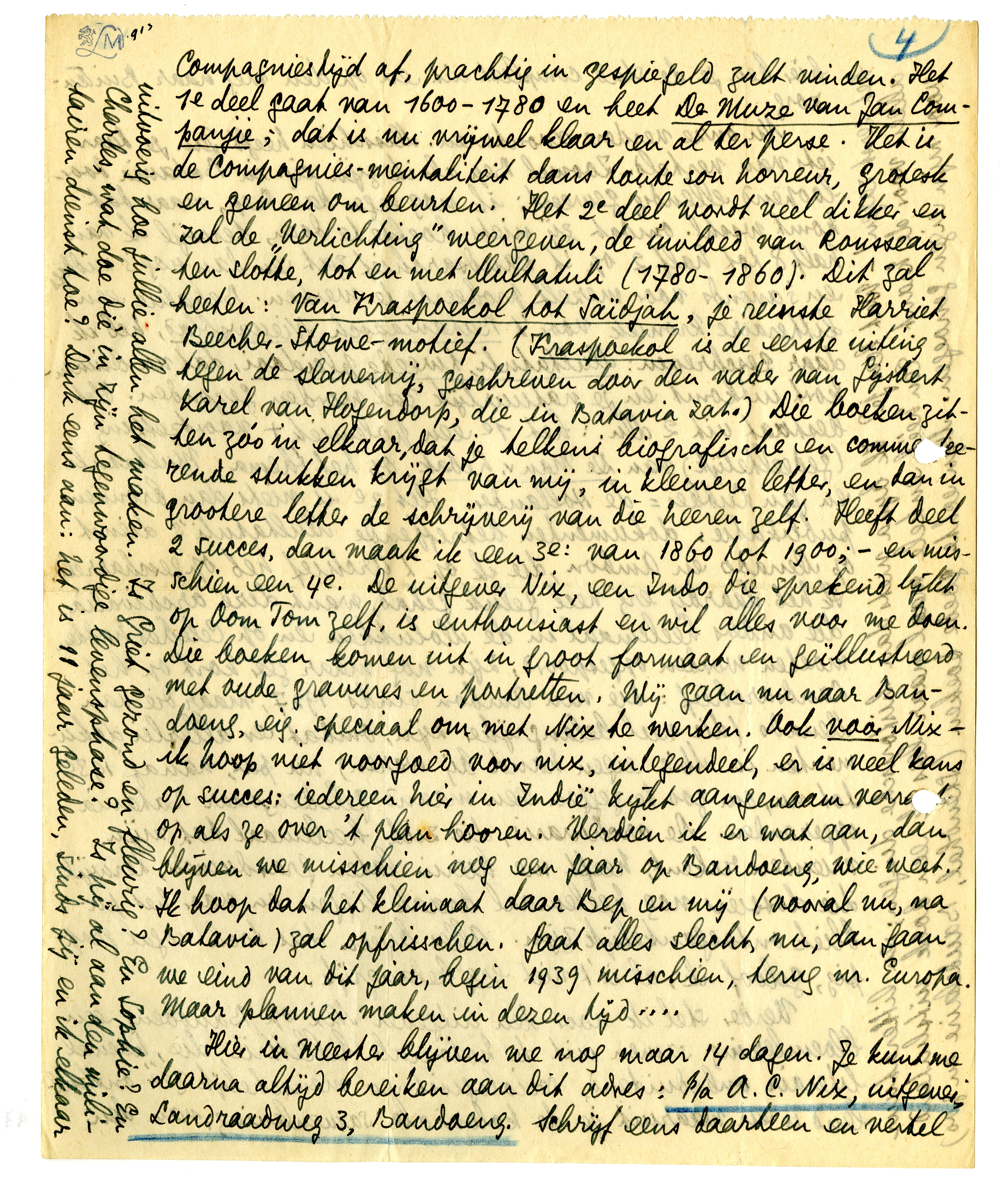 Hier in Meester blijven we nog maar 14 dagen. Je kunt me daarna altijd bereiken aan dit adres: p/a A.C. Nix, uitgever, Landraadweg 3, Bandoeng. Schrijf eens daarheen en vertel uitvoerig hoe jullie allen het maken. Is Griet gezond en fleurig? En Sophie? En Charles, wat doe die in zijn tegenwoordige levensphase? Is hij al aan den militairen dienst toe? Denk eens aan: het is 11 jaar geleden, sinds jij en ik elkaar het eerst zagen! - Wat lees je? Ik bijna niets dan historische dingen; en litteratuur alleen voor de krant. Een héél enkele maal maar lees ik een boek uitsluitend voor mijn eigen genoegen. Mijn echte goede boeken (Stendhal, Baudelaire en zoo) heb ik niet uitgepakt sinds mijn vertrek uit Tjitjoeroeg, dus sinds October '37. Dat moet nu in Bandoeng maar weer eens gebeuren, zoodra we daar een huis hebben. Van hieruit gaan we eerst 14 dagen logeeren op Ran-tjasoeni, een theeonderneming boven Bandoeng, waar mijn vriend Adé Tissing nu administrateur is. Zoo krijgt Bep gelegenheid om rustig naar een woning voor ons in Bandoeng zelf uit te kijken.