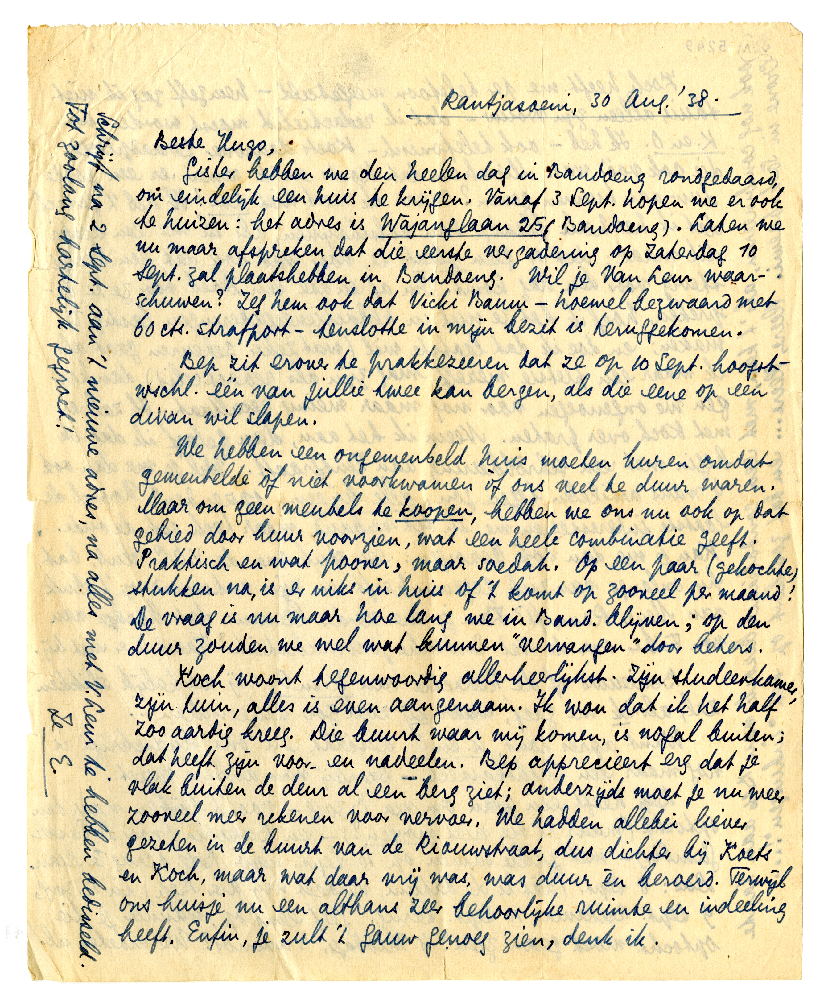 Gister hebben we den heelen dag in Bandoeng rondgedaasd, om eindelijk een huis te krijgen. Vanaf 3 Sept. hopen we er ook te huizen: het adres is Wajanglaan 25 (Bandoeng). Laten we nu maar afspreken dat die eerste vergadering op Zaterdag 10 Sept. zal plaats hebben in Bandoeng. Wil je Van Leur waarschuwen? Zeg hem ook dat Vicki Baum5542 - hoewel bezwaard met 60 ets. strafport - tenslotte in mijn bezit is teruggekomen.
