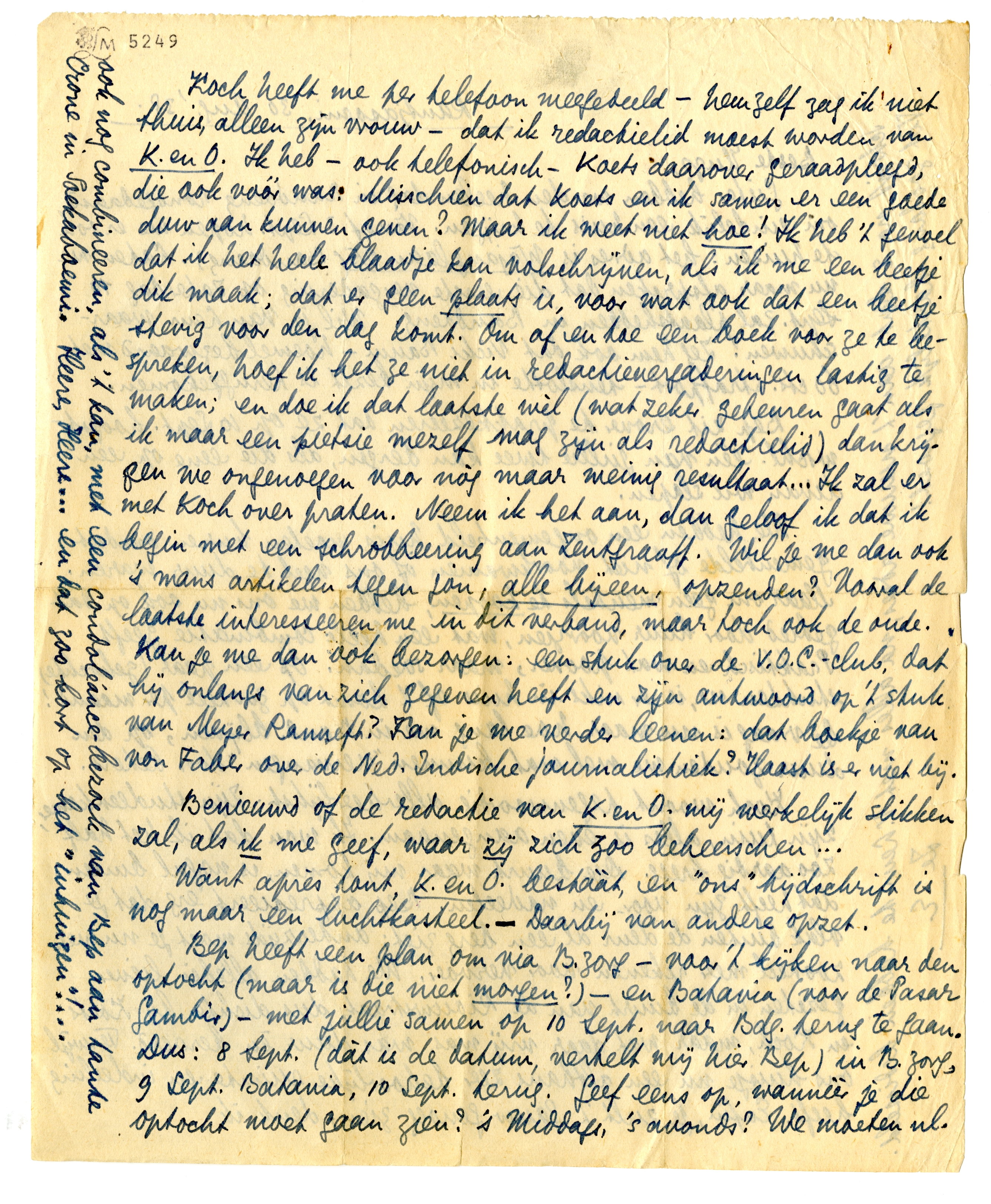 Koch heeft me per telefoon meegedeeld - hemzelf zag ik niet thuis, alleen zijn vrouw - dat ik redactielid moest worden van K. en O.5543 Ik heb - ook telefonisch - Koets daarover geraadpleegd, die ook vóór was. Misschien dat Koets en ik samen er een goede duw aan kunnen geven? Maar ik weet niet hoe! Ik heb 't gevoel dat ik het heele blaadje kan volschrijven, als ik me een beetje dik maak; dat er geen plaats is, voor wat ook dat een beetje stevig voor den dag komt. Om af en toe een boek voor ze te bespreken, hoef ik het ze niet in redactievergaderingen lastig te maken; en doe ik dat laatste wèl (wat zeker gebeuren gaat als ik maar een pietsie mezelf mag zijn als redactielid) dan krijgen we ongenoegen voor nòg maar weinig resultaat... Ik zal er met Koch over praten. Neem ik het aan, dan geloof ik dat ik begin met een schrobbeering aan Zentgraaff. Wil je me dan ook 's mans artikelen tegen jou, alle bijeen, opzenden? Vooral de laatste interesseeren me in dit verband, maar toch ook de oude.5544
