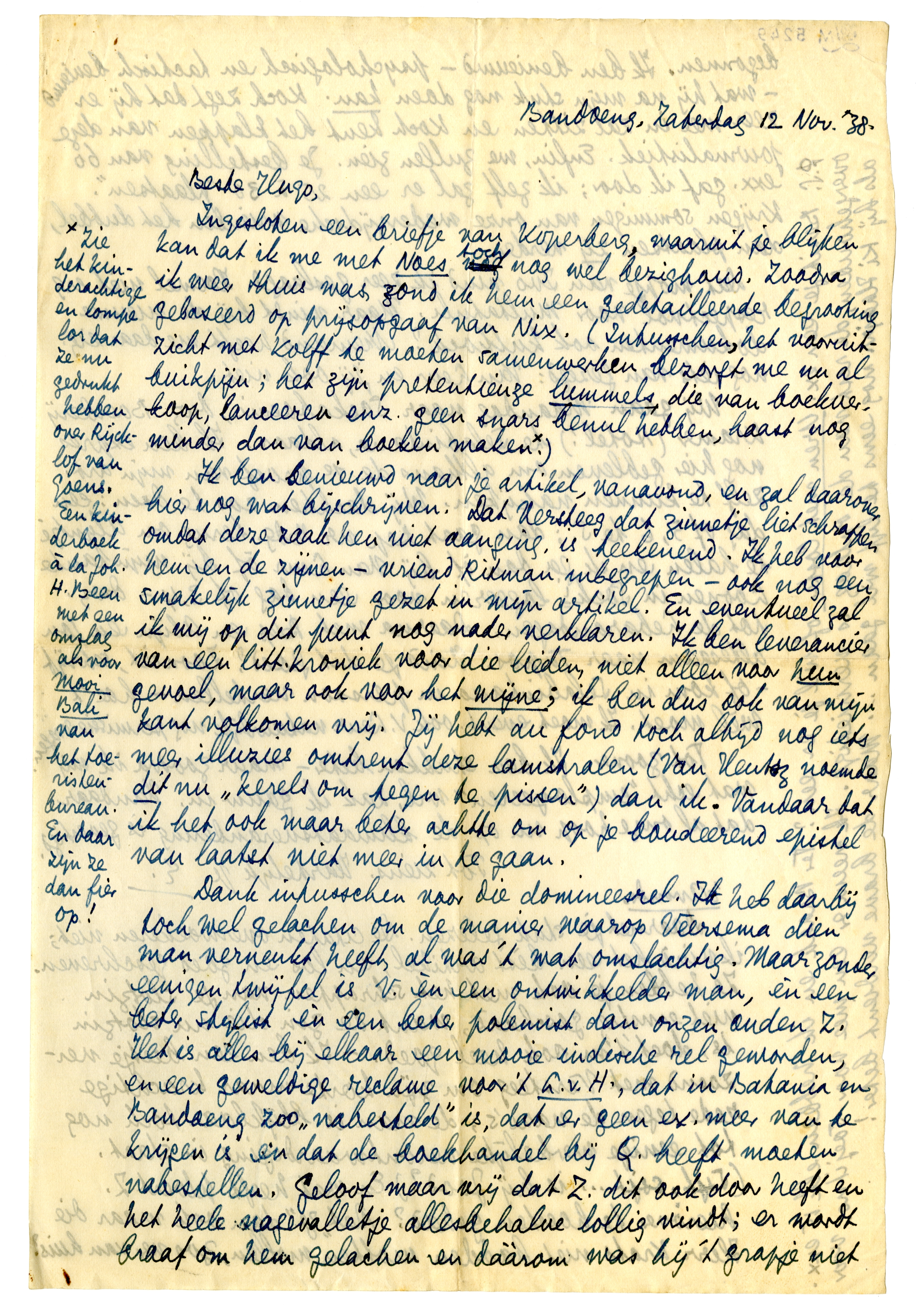 Dank intusschen voor die domineesrel. Ik heb daarbij toch wel gelachen om de manier waarop Veersema dien man verneukt heeft, al was 't wat omslachtig. Maar zonder eenigen twijfel is V. èn een ontwikkelder man, èn een beter stylist èn een betere polemist dan onzen ouden Z. Het is alles bij elkaar een mooie indische rel geworden, en een geweldige reclame voor 't L.v.H., dat in Batavia en Bandoeng zoo ‘nabesteld’ is, dat er geen ex. meer van te krijgen is en dat de boekhandel bij Q. heeft moeten nabestellen. Geloof maar vrij dat Z. dit ook door heeft en het heele nagevalletje allesbehalve lollig vindt; er wordt braaf om hem gelachen en dààrom was hij 't grapje niet begonnen. Ik ben benieuwd - psychologisch en tactisch benieuwd - wat hij na mijn stuk nog doen kan. Koch zegt dat hij er zeer mee in zal zitten en Koch kent het klappen van deze journalistiek. Enfin, we zullen zien. Je bestelling van 60 exx. gaf ik door; ik zelf zal er een 25 à 30 ‘plaatsen’. Krijgen sommigen van onze wederzijdsche vrienden het dubbel, dan plaatsen zij verder.