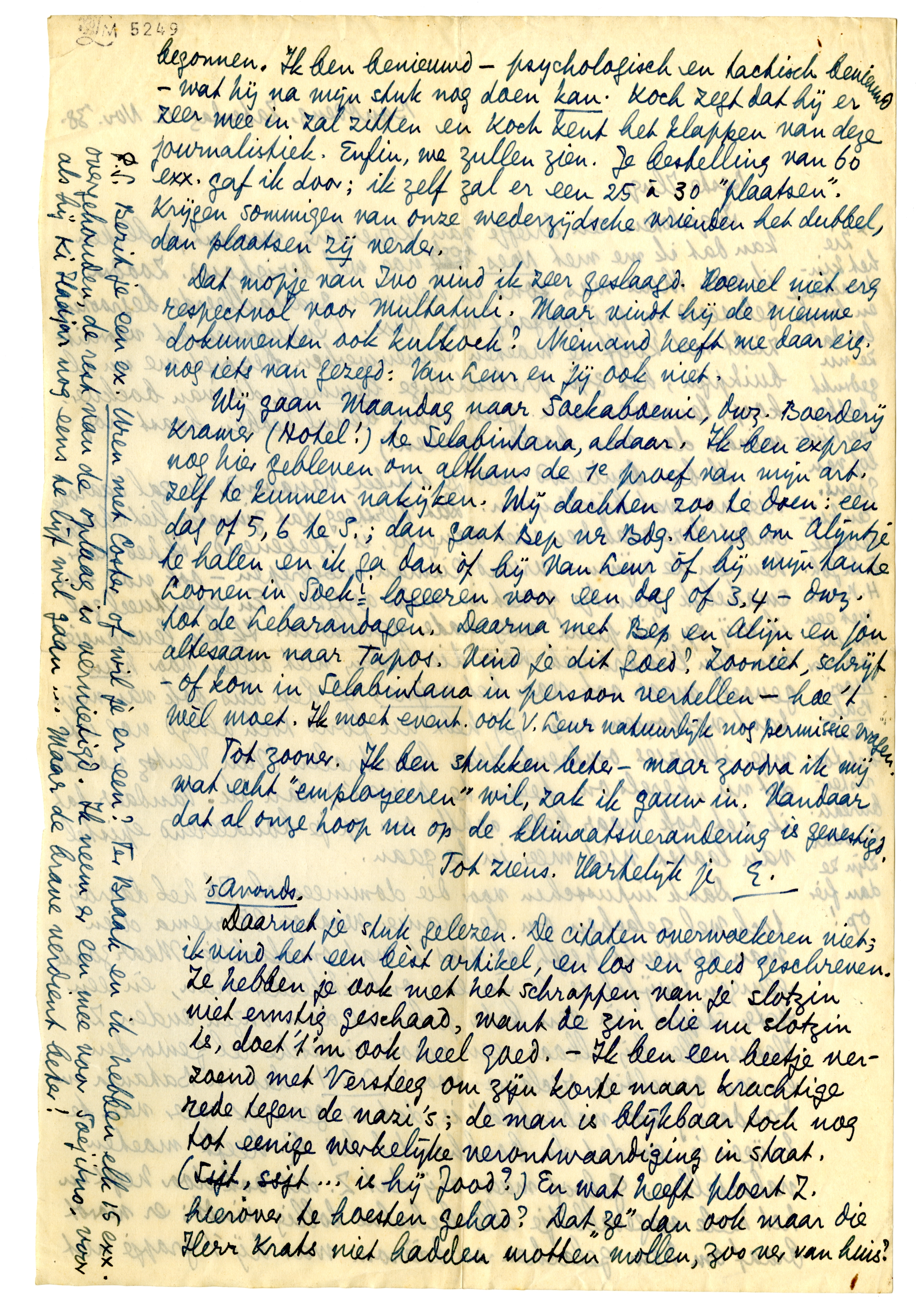 Wij gaan Maandag naar Soekaboemi, dwz. Boerderij Kramer (Hotel!) te Selabintana, aldaar. Ik ben expres nog hier gebleven om althans de 1e proef van mijn art. zelf te kunnen nakijken. Wij dachten zoo te doen: een dag of 5, 6 te S; dan gaat Bep nr. Bdg. terug om Alijntje te halen en ik ga dan òf bij Van Leur òf bij mijn tante Loonen5656 in Soeki. logeeren voor een dag of 3, 4 - dwz. tot de Lebarandagen.5657 Daarna met Bep en Alijn en jou altesaam naar Tapos.5658 Vind je dit goed? Zooniet, schrijf - of kom in Selabintana in persoon vertellen - hoe 't wèl moet. Ik moet event. ook V. Leur natuurlijk nog permissie vragen.