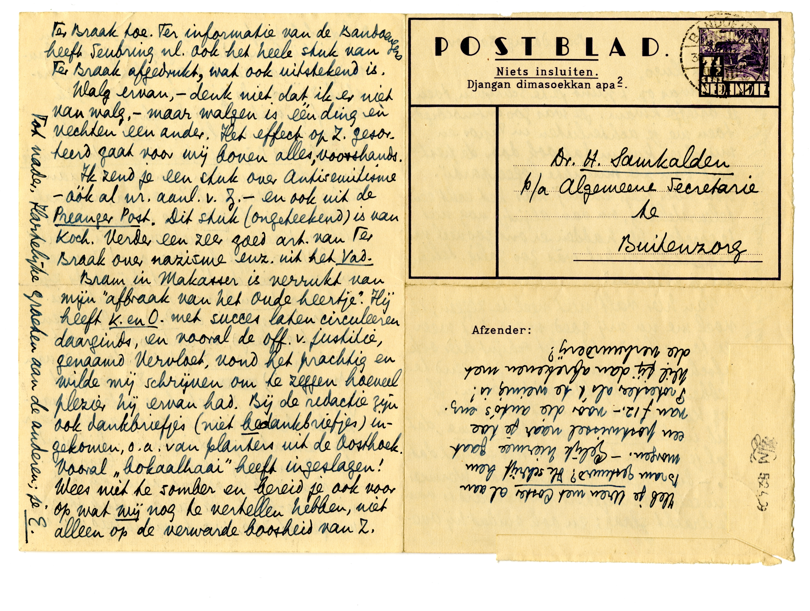Het art. in de J.B. zag ik nog steeds niet en Koets ook niet; maar is het niet best? Nu schrijft hij over ons! Je moet overigens niet denken dat hij sinds zijn stuk voor K. en O. met rust gelaten is. Seubring heeft in de Preanger Post een 2e stuk gepleegd, in antwoord op dat fraais in het A.I.D. (dat inderdaad van Wormser is) waarin Z. weer goed gepest wordt.5699 Dit stuk is beter, amusanter, dan het vorige, en er staan een paar zeer vermakelijke dingen in. Dit wordt door Bandoeng verspreid in 5000 exx. en daar Z. hier woont, vindt hij dat niksnie-leuk. Ik zal je 't stuk sturen, morgen of zoo, want wat ik had is al naar Ter Braak toe. Ter informatie van de Bandoengers heeft Seubring nl. ook het heele stuk van Ter Braak afgedrukt, wat ook uitstekend is.