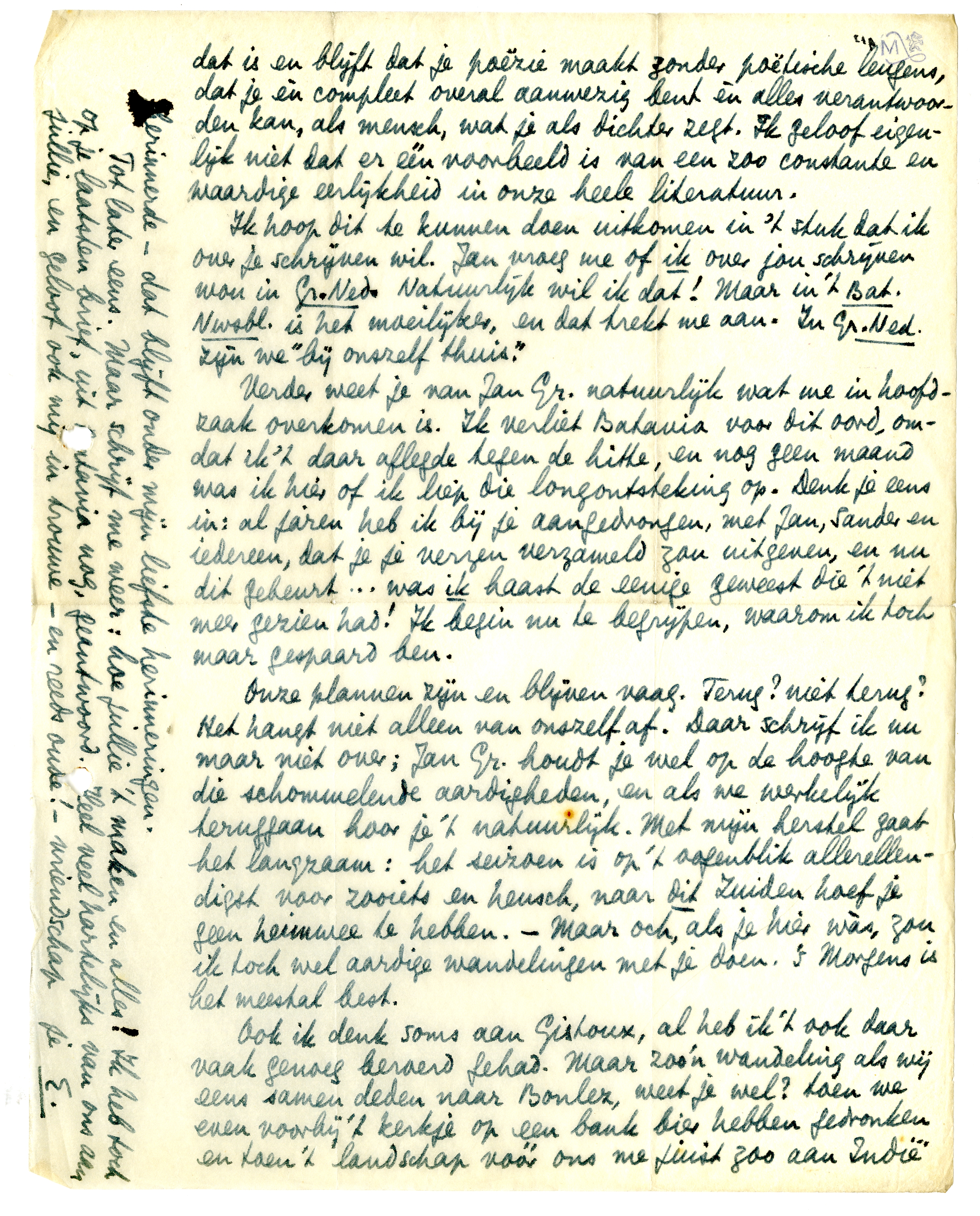 Verder weet je van Jan Gr. natuurlijk wat me in hoofdzaak overkomen is. Ik verliet Batavia voor dit oord, omdat ik 't daar aflegde tegen de hitte, en nog geen maand was ik hier of ik liep die longontsteking op. Denk je eens in: al jaren heb ik bij je aangedrongen, met Jan, Sander en iedereen, dat je je verzen verzameld zou uitgeven, en nu dit gebeurt... was ik haast de eenige geweest die 't niet meer gezien had! Ik begin nu te begrijpen, waarom ik toch maar gespaard ben.