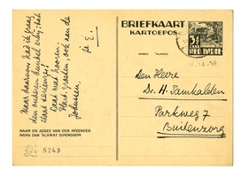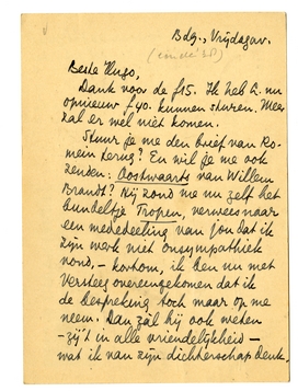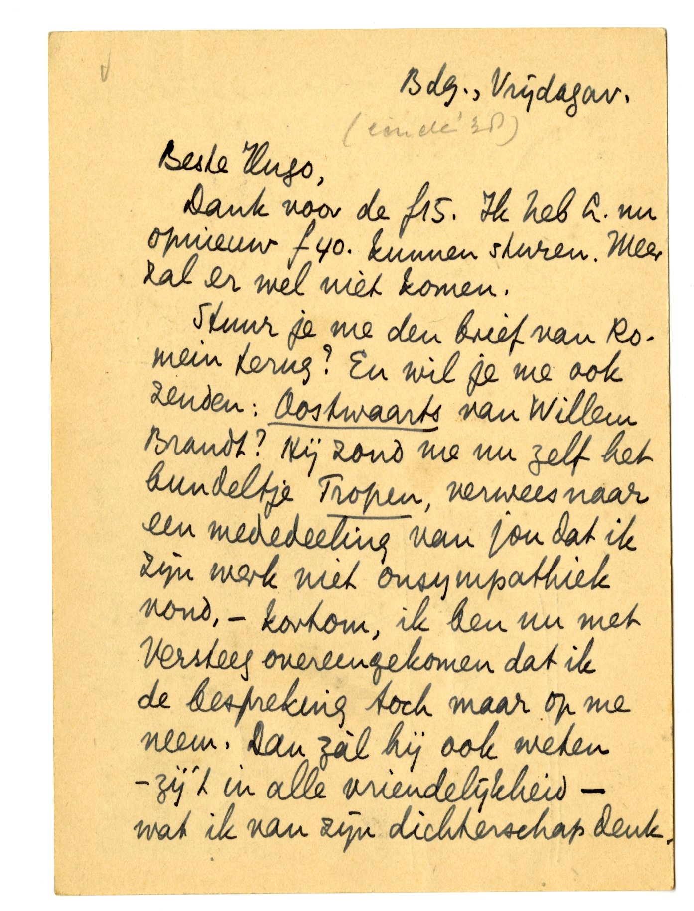 Stuur je me den brief van Romein terug? En wil je me ook zenden: Oostwaarts van Willem Brandt? Hij zond me nu zelf het bundeltje Tropen, verwees naar een mededeeling van jou dat ik zijn werk niet onsympathiek vond, - kortom, ik ben nu met Versteeg overeengekomen dat ik de bespreking toch maar op me neem. Dan zàl hij ook weten - zij 't in alle vriendelijkheid - wat ik van zijn dichterschap denk.