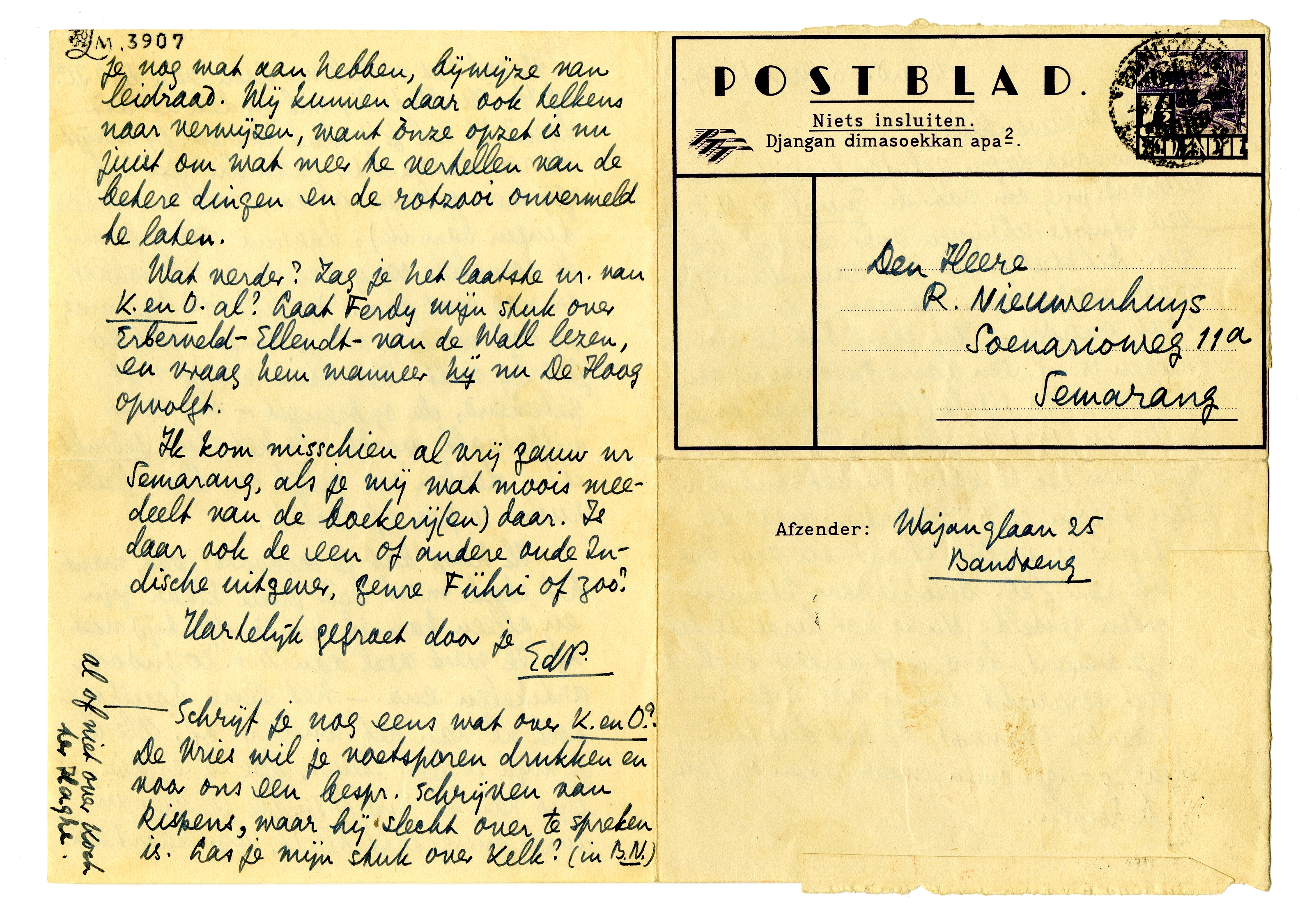 Ik zal het 1e deel nu doen, van de O.I.C. af t/m Multatuli; wil jij dan de rest doen? Ik zal je 't stuk sturen, jij schrijft de rest daarachter (van die rest heb jij meer gelezen of even veel en àndere dingen dan ik); daarna stuur je mij de complete copy terug en ik schaaf er nog wat aan. In mijn 1e deel mag jij ook werken, als je dingen ziet die je erbij wilt. Het stuk wordt niet geteekend, de opbrengst - die eerst uitbetaald wordt als het stuk gedrukt is! - deelen we gelijk op. Dus ieder ruim 10 pop of zooiets.5949