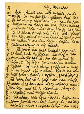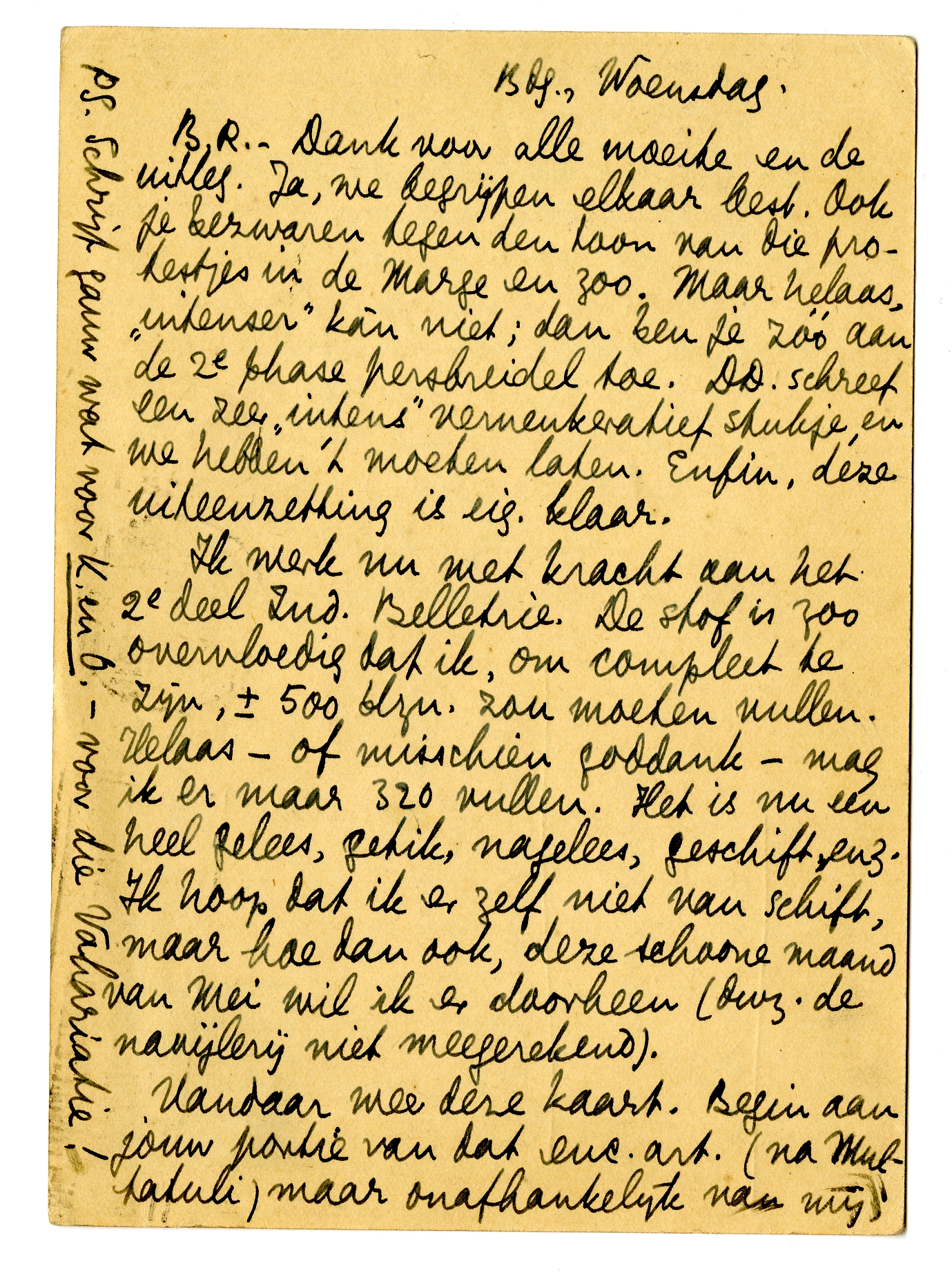 B.R. - Dank voor alle moeite en de uitleg. Ja, we begrijpen elkaar best. Ook je bezwaren tegen den toon van die protestjes in de Marge6075 en zoo. Maar helaas, ‘intenser’ kàn niet; dan ben je zóó aan de 2e phase persbreidel6076 toe. DD. schreef een zeer ‘intens’ verneukeratief stukje, en we hebben 't moeten laten. Enfin, deze uiteenzetting is eig. klaar.