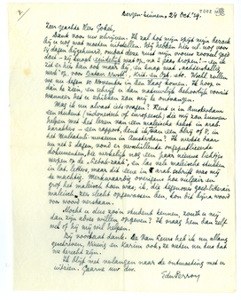 Mag ik nu alvast iets vragen? Kent u in Amsterdam een student (indonesisch of europeesch) die mij zou kunnen helpen met het lezen van een maleische tekst in arab. karakters - een rapport, denk ik - van een blzij of 8, in het Multatuli-museum in Amsterdam? Ik werkte daar nu net 3 dagen, vond er verschillende ongepubliceerde dokumenten, die werkelijk nog een paar nieuwe lichtjes werpen op de ‘Lebak-zaak’, en las vele maleische stukken in lat. letters, maar dit eene in arab. schrift was mij te machtig.6274 Merkwaardig overigens hoe vulgair en grof het maleisch toen was; ik, die tegenover goedlitterair maleisch zeer slecht opgewassen ben, kon dit bijna woord voor woord verstaan.