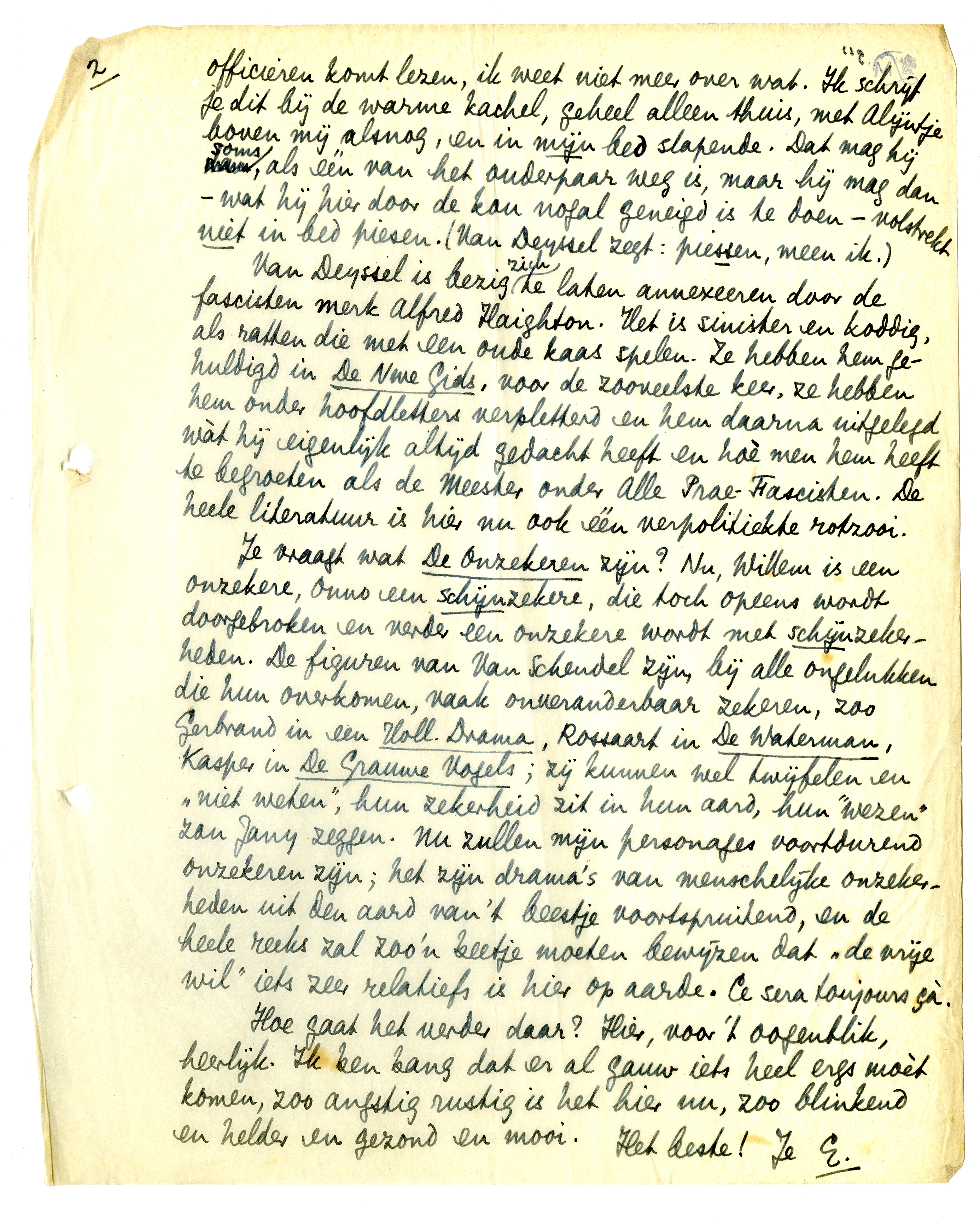 Je vraagt wat De Onzekeren zijn? Nu, Willem is een onzekere, Onno een schijnzekere, die toch opeens wordt doorgebroken en verder een onzekere wordt met schijnzekerheden. De figuren van Van Schendel zijn, bij alle ongelukken die hun overkomen, vaak onveranderbaar zekeren, zoo Gerbrand in een Holl. Drama, Rossaart in De Waterman, Kasper in De Grauwe Vogels; zij kunnen wel twijfelen en ‘niet weten’, hun zekerheid zit in hun aard, hun ‘wezen’ zou Jany zeggen. Nu zullen mijn personages voortdurend onzekeren zijn; het zijn drama's van menschelijke onzekerheden uit den aard van 't beestje voortspruitend, en de heele reeks zal zoo'n beetje moeten bewijzen dat ‘de vrije wil’ iets zeer relatiefs is hier op aarde. Ce sera toujours çà.