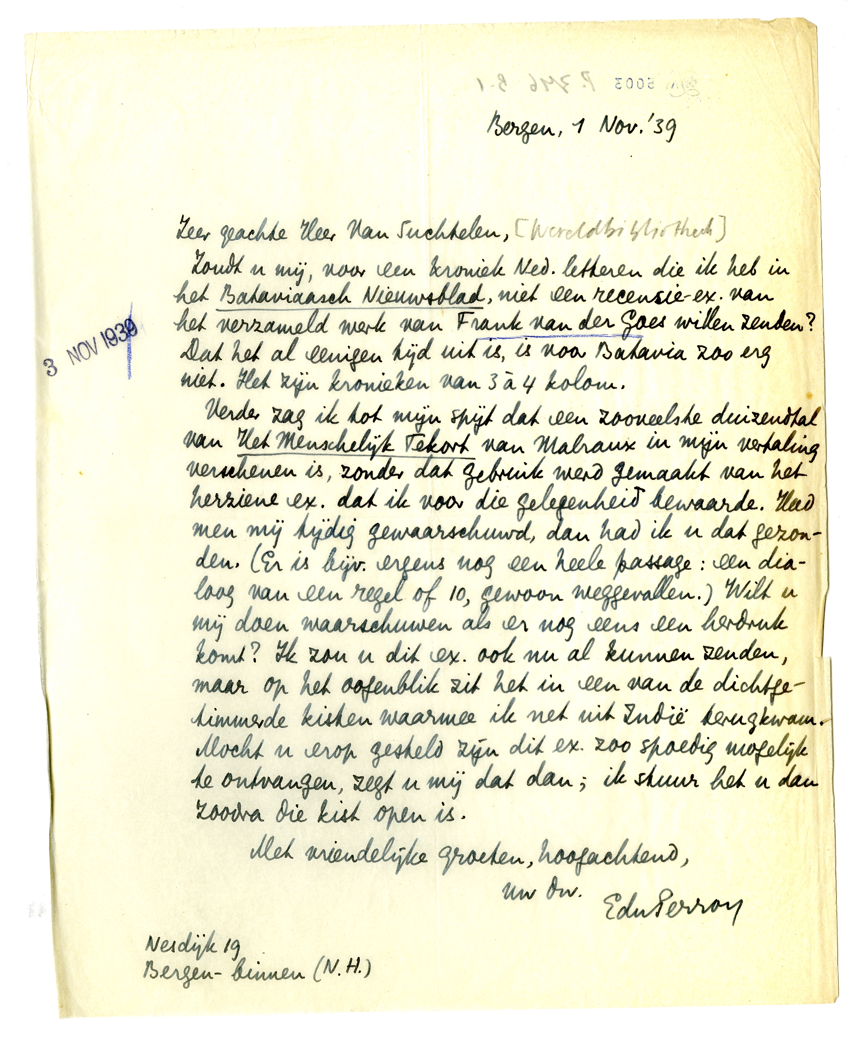 Verder zag ik tot mijn spijt dat een zooveelste duizendtal van Het Menschelijk Tekort van Malraux in mijn vertaling verschenen is, zonder dat gebruik werd gemaakt van het herziene ex.6346 dat ik voor die gelegenheid bewaarde. Had men mij tijdig gewaarschuwd, dan had ik u dat gezonden. (Er is bijv. ergens nog een heele passage: een dialoog van een regel of 10, gewoon weggevallen.) Wilt u mij doen waarschuwen als er nog eens een herdruk komt? Ik zou u dit ex. ook nu al kunnen zenden, maar op het oogenblik zit het in een van de dichtgetimmerde kisten waarmee ik net uit Indië terugkwam. Mocht u erop gesteld zijn dit ex. zoo spoedig mogelijk te ontvangen, zegt u mij dat dan; ik stuur het u dan zoodra die kist open is.