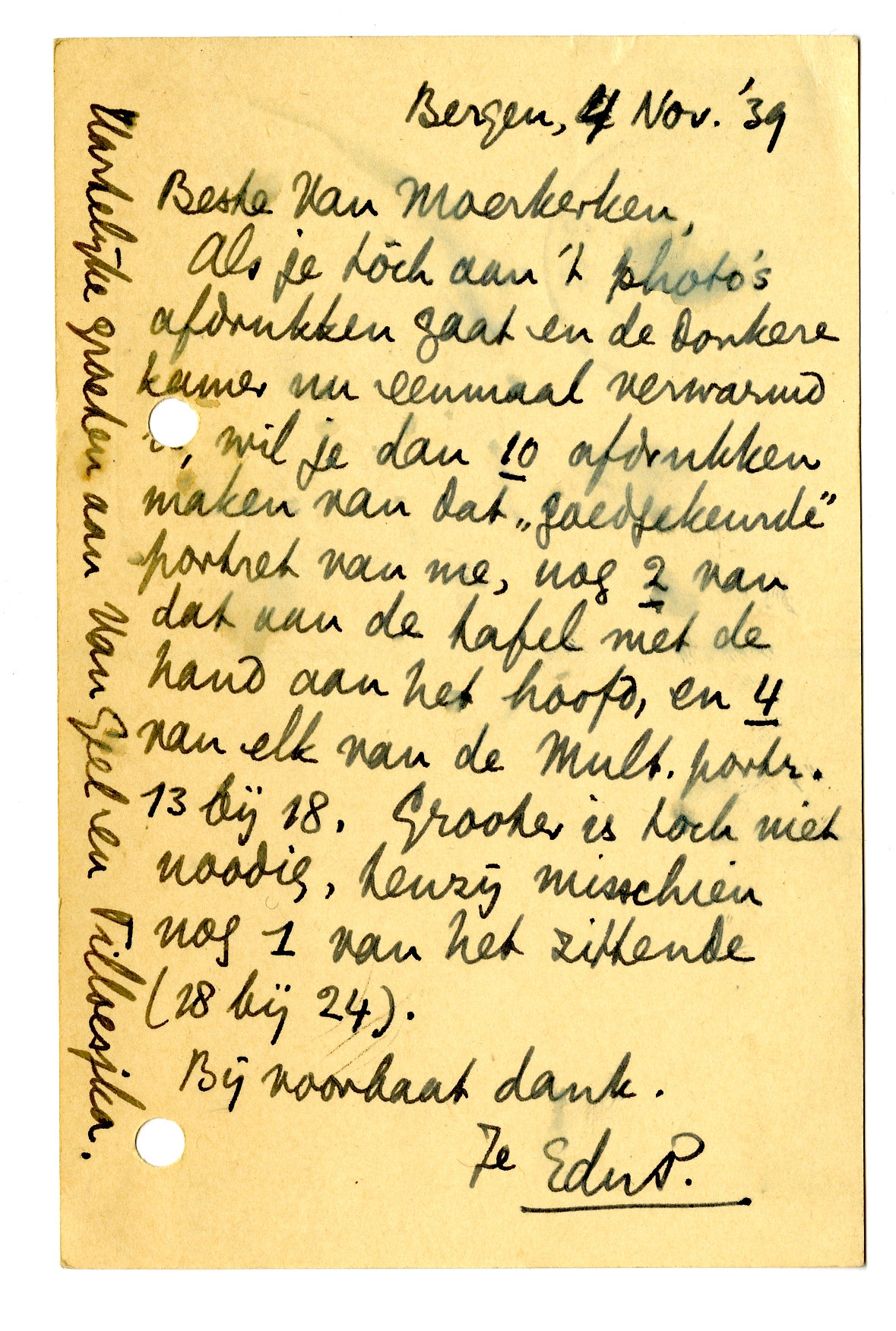 Als je tòch aan 't photo's afdrukken gaat en de donkere kamer nu eenmaal verwarmd is, wil je dan 10 afdrukken maken van dat ‘goedgekeurde’ portret van me,6349 nog 2 van dat aan de tafel met de hand aan het hoofd, en 4 van elk van de Mult. portr. 13 bij 18. Grooter is toch niet noodig, tenzij misschien nog 1 van het zittende 18 bij 24).