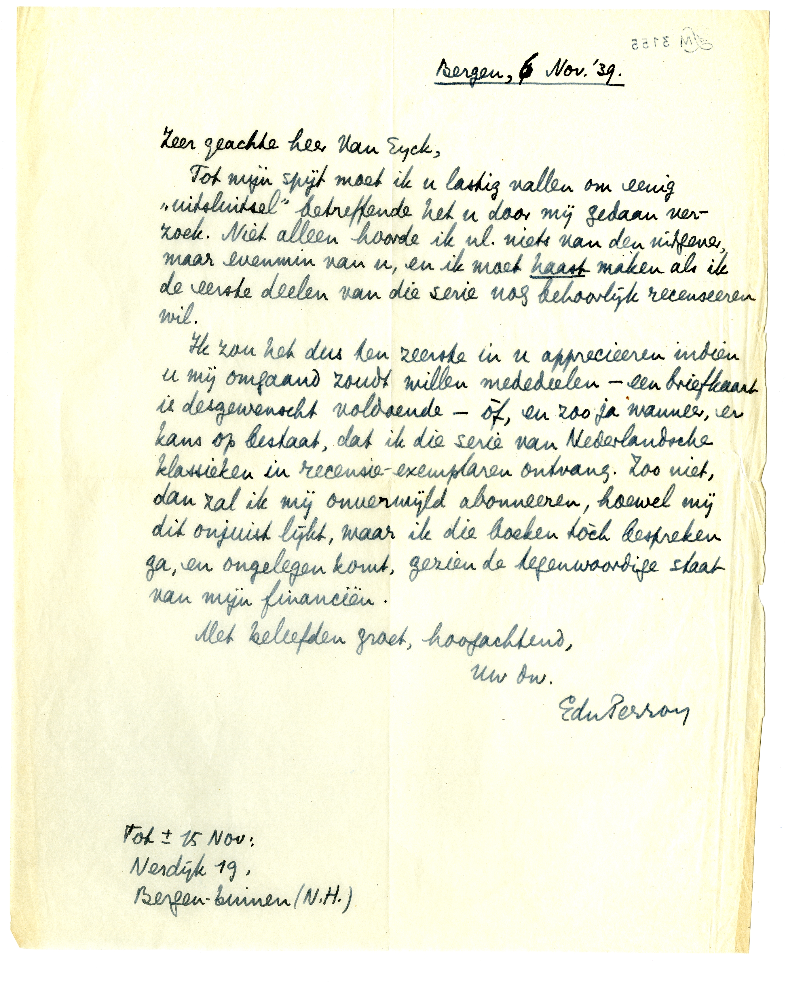 Tot mijn spijt moet ik u lastig vallen om eenig ‘uitsluitsel’ betreffende het u door mij gedaan verzoek. Niet alleen hoorde ik nl. niets van den uitgever, maar evenmin van u, en ik moet haast maken als ik de eerste deelen van die serie nog behoorlijk recenseeren wil.