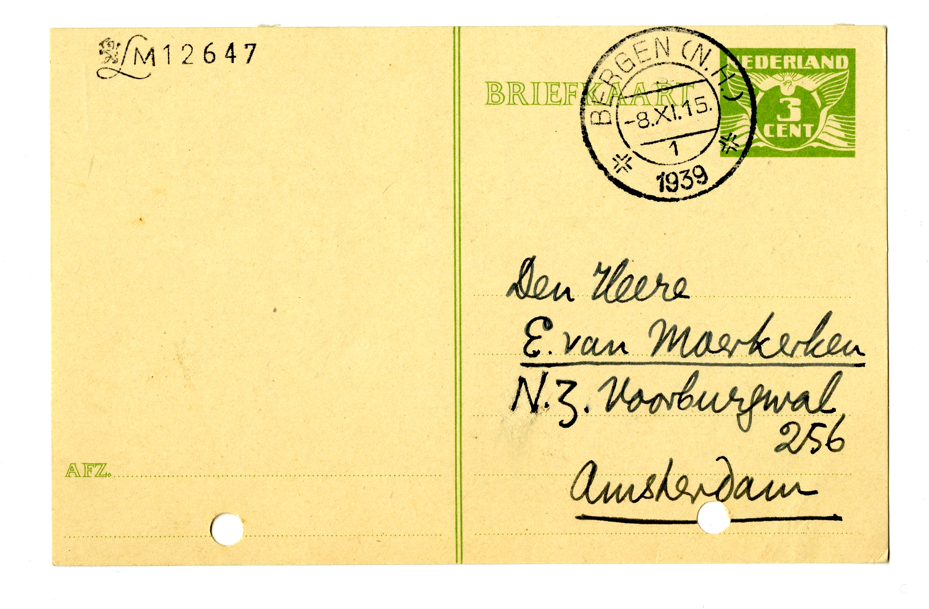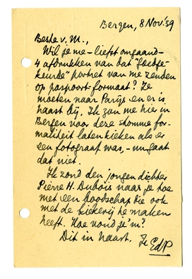 Wil je me - liefst omgaand - 4 afdrukken van dat ‘goedgekeurde’ portret van me zenden op paspoort-formaat? Ze moeten naar Parijs en er is haast bij. Ik zou me hier in Bergen voor deze stomme formaliteit laten kieken als er een fotograaf was, - nu gaat dat niet.