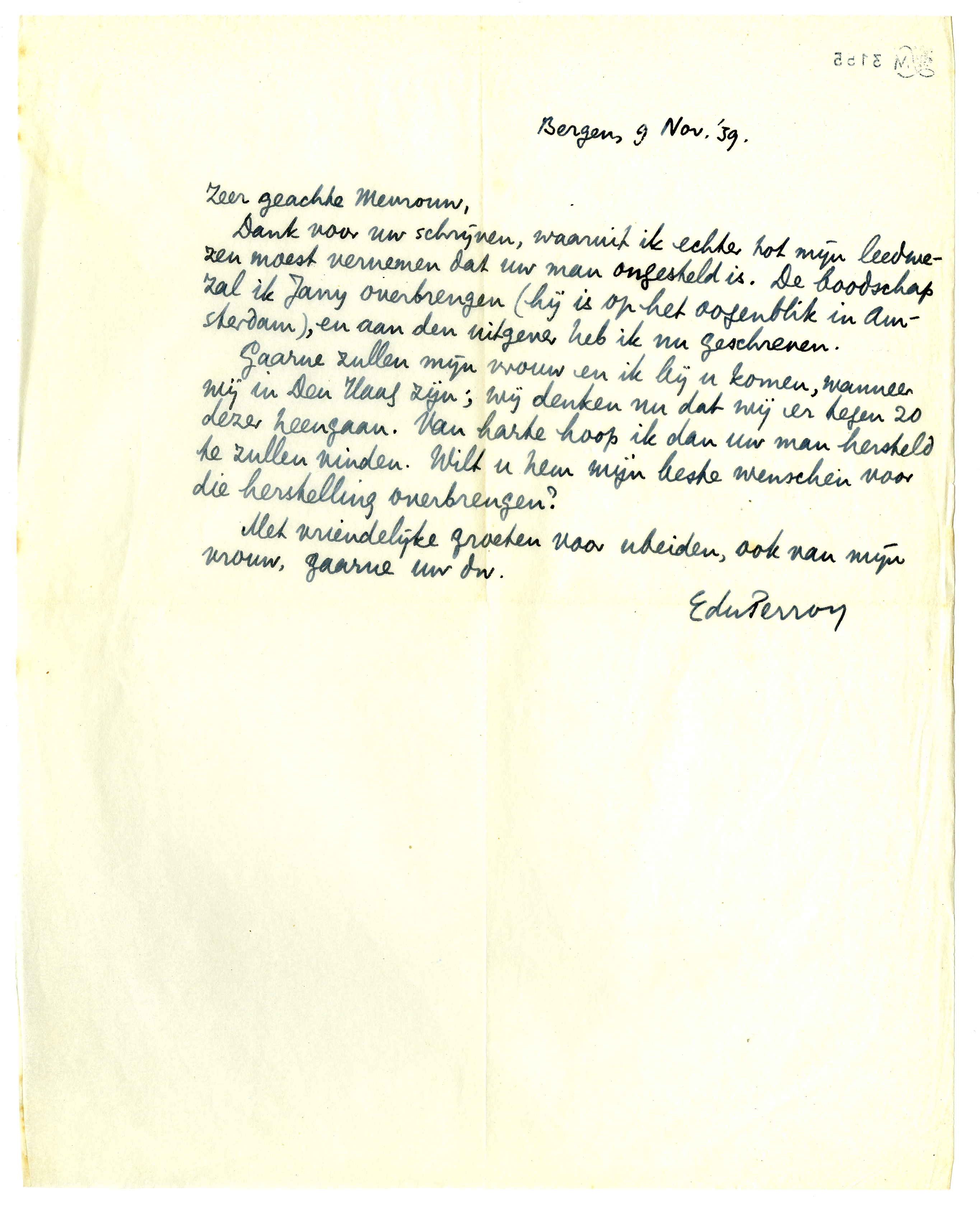 Dank voor uw schrijven, waaruit ik echter tot mijn leedwezen moest vernemen dat uw man ongesteld is. De boodschap zal ik Jany overbrengen (hij is op het oogenblik in Amsterdam), en aan den uitgever heb ik nu geschreven.6369