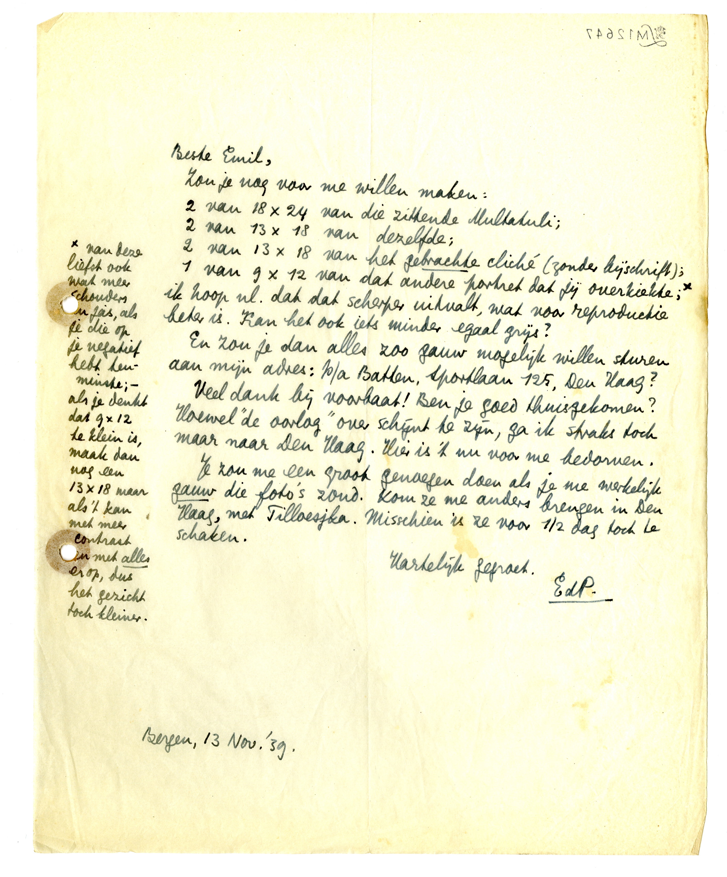 En zou je dan alles zoo gauw mogelijk willen sturen aan mijn adres: p/a Batten, Sportlaan 125, Den Haag?