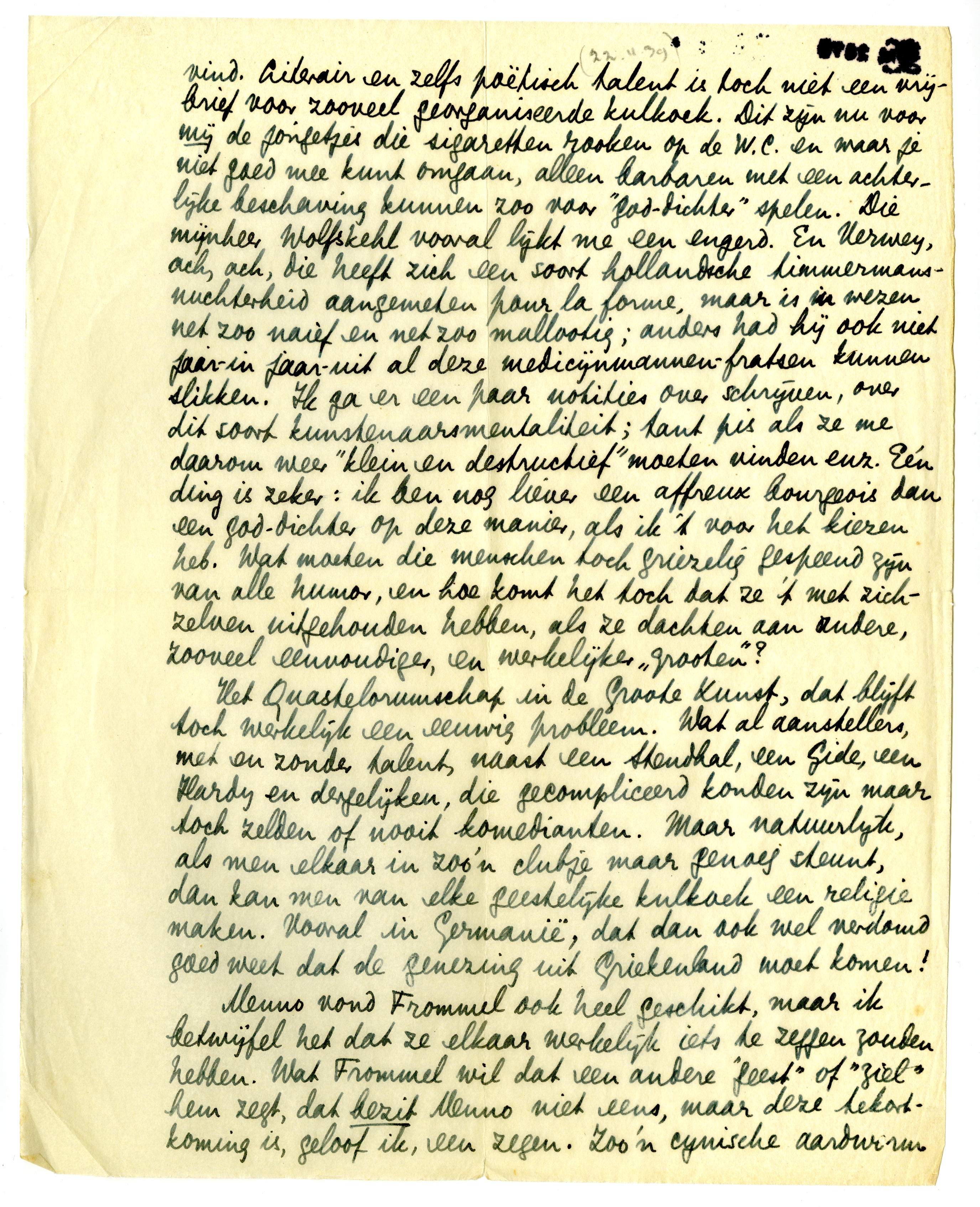 Menno vond Frommel ook heel geschikt, maar ik betwijfel het dat ze elkaar werkelijk iets te zeggen zouden hebben. Wat Frommel wil dat een andere ‘geest’ of ‘ziel’ hem zegt, dat bezit Menno niet eens, maar deze tekortkoming is, geloof ik, een zegen. Zoo'n cynische aardworm als Menno kan om zoo'n engel als George eigenlijk alleen lachen. Dat komt dan niet te pas - hoewel, waarom? Omdat George toch mooie verzen schrijft? Maar is 't niet een kenmerk van werkelijke ‘geest’ - ook van ‘hoogere geest’ - dat men de mooie verzen wantrouwt van een individu dat erin slaagt op diè ‘hoogere-kitsch’-manier met zichzelf te leven? (en er dan nog leerlingen bij kweekt die er allemaal naar streven op hem te lijken).