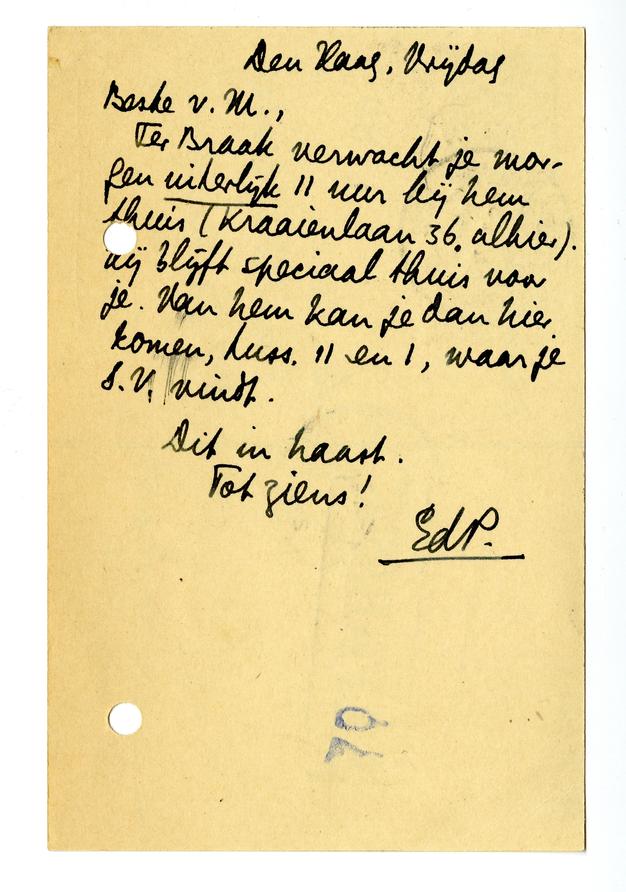 Ter Braak verwacht je morgen uiterlijk 11 uur bij hem thuis6434 (Kraaienlaan 36, alhier). Hij blijft speciaal thuis voor je. Van hem kan je dan hier6435 komen, tuss. 11 en 1, waar je S.V. vindt.6436