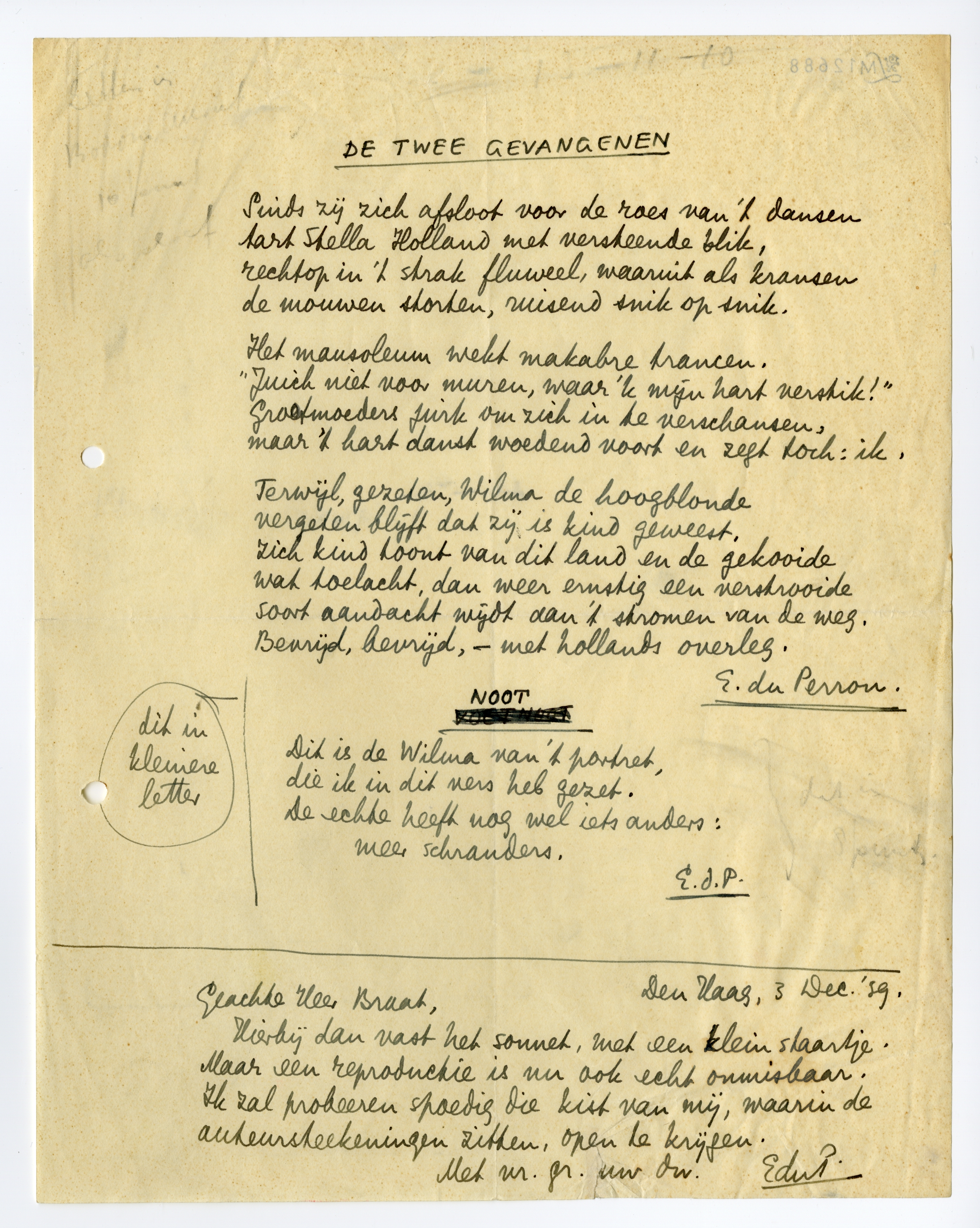 Hierbij dan vast het sonnet,6458 met een klein staartje. Maar een reproductie is nu ook echt onmisbaar. Ik zal probeeren spoedig die kist van mij, waarin de auteursteekeningen zitten, open te krijgen.