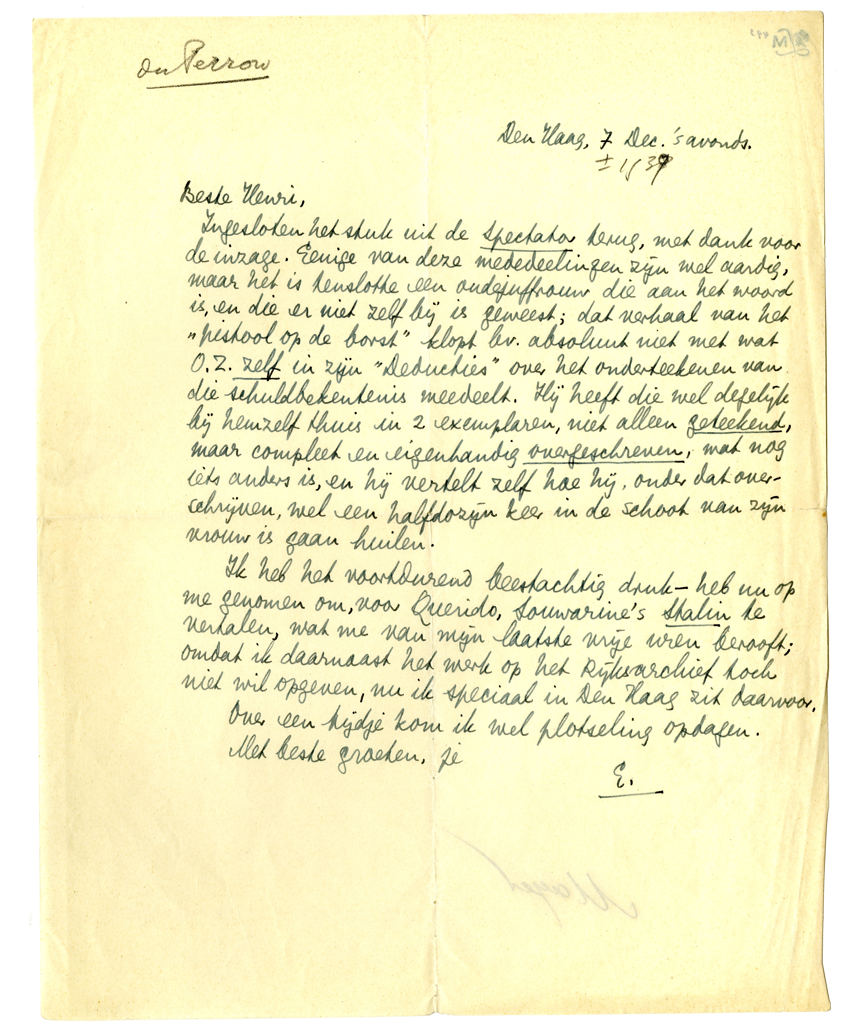 Ik heb het voortdurend beestachtig druk - heb nu op me genomen om, voor Querido, Souwarine's Stalin te vertalen, wat me van mijn laatste vrije uren berooft; omdat ik daarnaast het werk op het Rijksarchief toch niet wil opgeven, nu ik speciaal in Den Haag zit daarvoor.