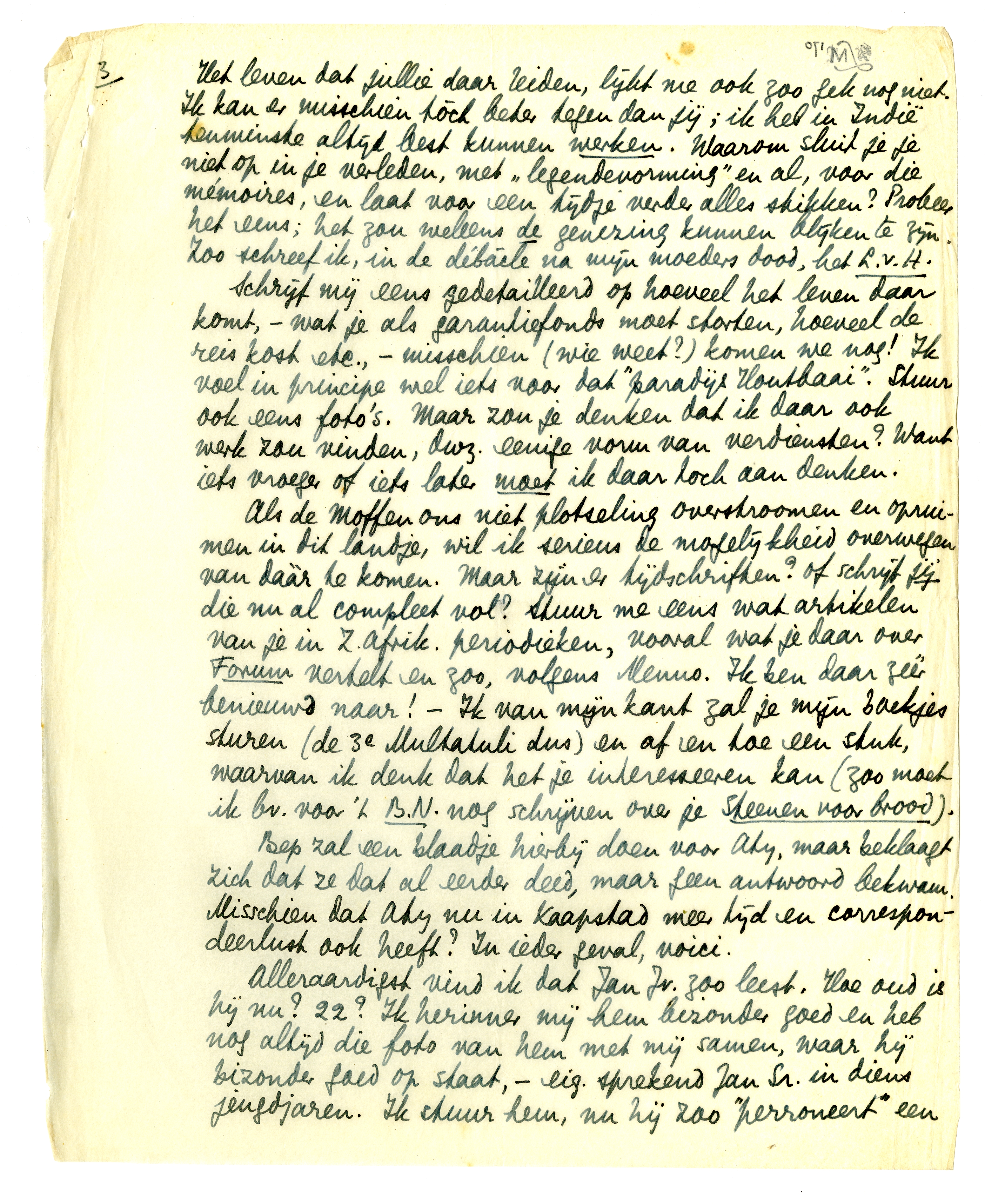 Als de Moffen ons niet plotseling overstroomen en opruimen in dit landje, wil ik serieus de mogelijkheid overwegen van dààr te komen. Maar zijn er tijdschriften? of schrijf jij die nu al compleet vol? Stuur me eens wat artikelen van je in Z. Afrik. periodieken, vooral wat je daar over Forum vertelt en zoo, volgens Menno.6535 Ik ben daar zéér benieuwd naar! - Ik van mijn kant zal je mijn boekjes sturen (de 3e Multatuli dus) en af en toe een stuk, waarvan ik denk dat het je interesseeren kan (zoo moet ik bv. voor 't B.N. nog schrijven over je Steenen voor brood6536).