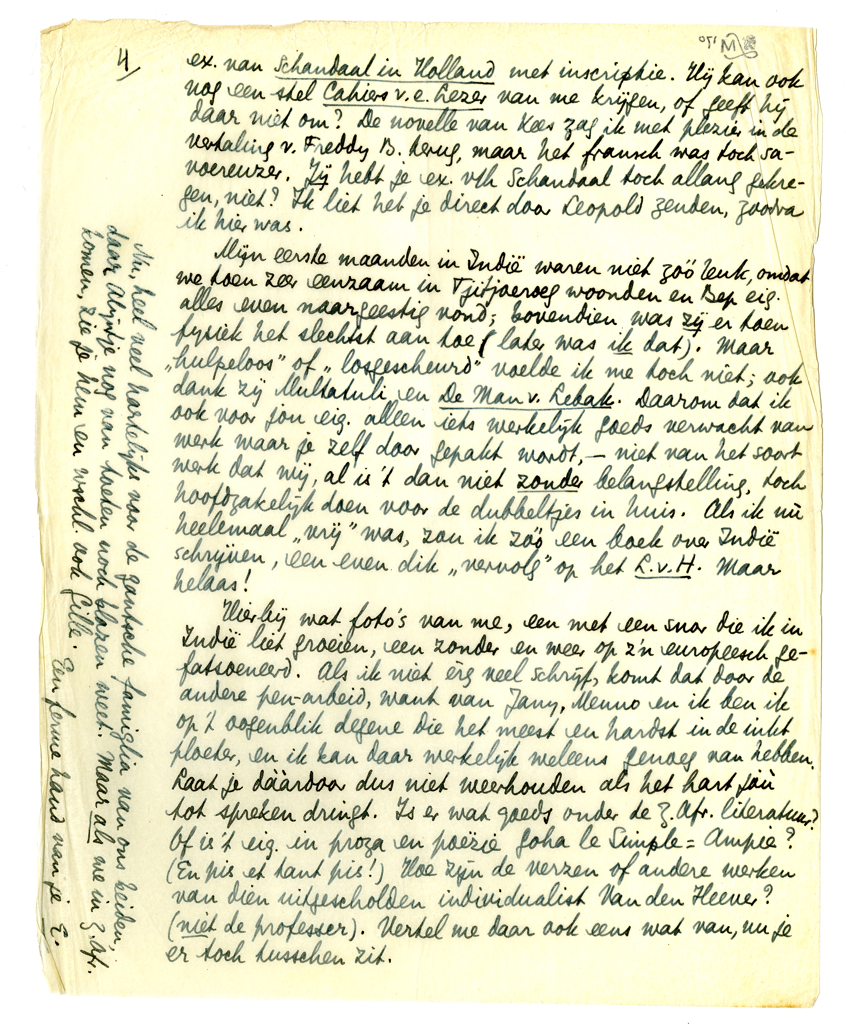 Mijn eerste maanden in Indië waren niet zóó leuk, omdat we toen zeer eenzaam in Tjitjoeroeg woonden en Bep eig. alles even naargeestig vond; bovendien was zij er toen fysiek het slechtst aan toe (later was ik dat). Maar ‘hulpeloos’ of ‘losgescheurd’ voelde ik me toch niet; ook dank zij Multatuli en De Man v. Lebak. Daarom dat ik ook voor jou eig. alleen iets werkelijk goeds verwacht van werk waar je zelf door gepakt wordt, - niet van het soort werk dat wij, al is 't dan niet zonder belangstelling, toch hoofdzakelijk doen voor de dubbeltjes in huis. Als ik nù heelemaal ‘vrij’ was, zou ik zóó een boek over Indië schrijven, een even dik ‘vervolg’ op het L.v.H. Maar helaas!