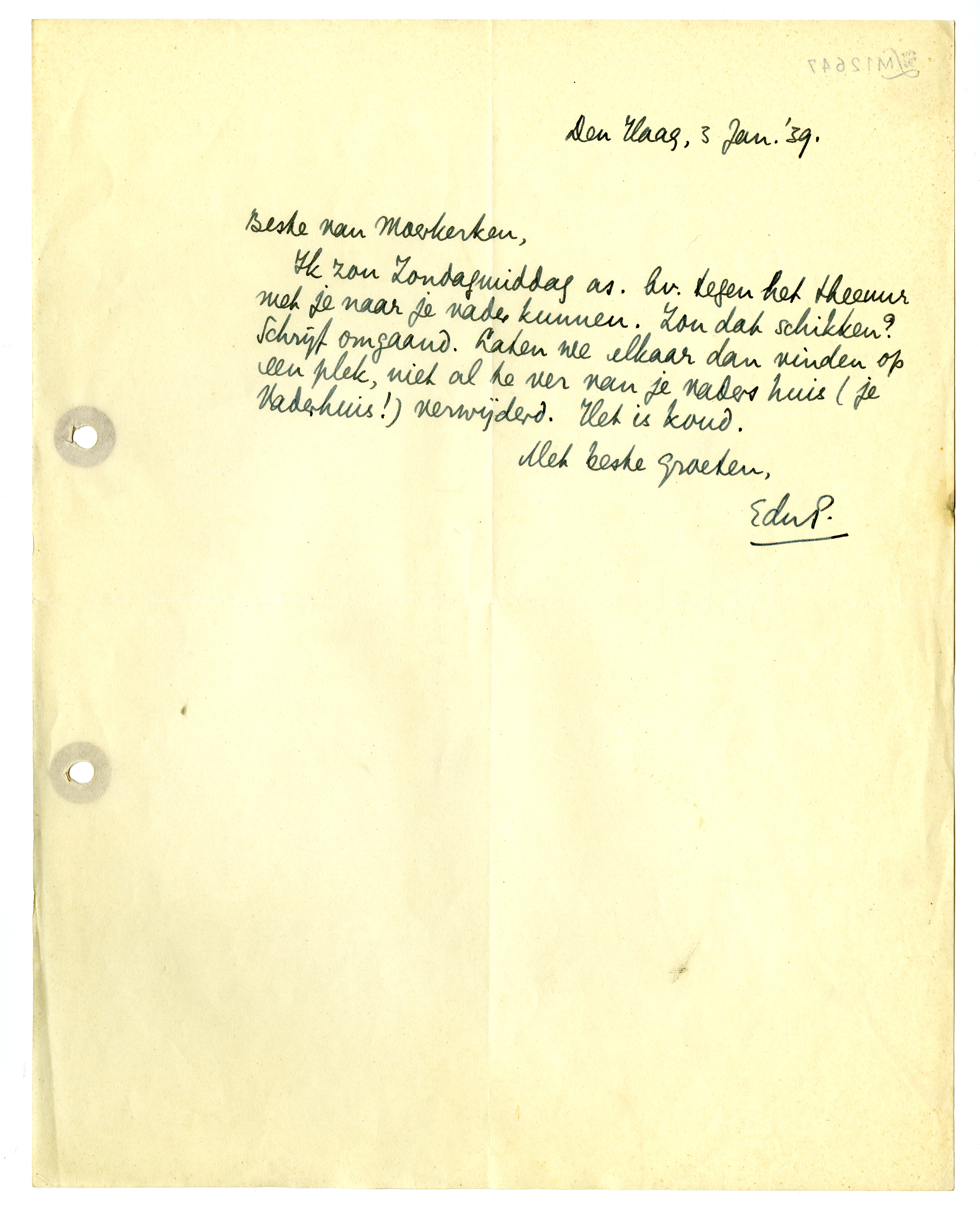 Ik zou Zondagmiddag as. bv. tegen het theeuur met je naar je vader kunnen. Zou dat schikken? Schrijf omgaand. Laten we elkaar dan vinden op een plek, niet al te ver van je vaders huis6592 (je Vaderhuis!) verwijderd. Het is koud.