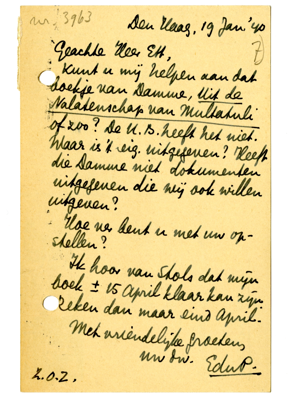 Kunt u mij helpen aan dat boekje van Damme, Uit de Nalatenschap van Multatuli6649 of zoo? De U.B. heeft het niet. Waar is 't eig. uitgegeven? Heeft die Damme niet dokumenten uitgegeven die wij ook willen uitgeven?