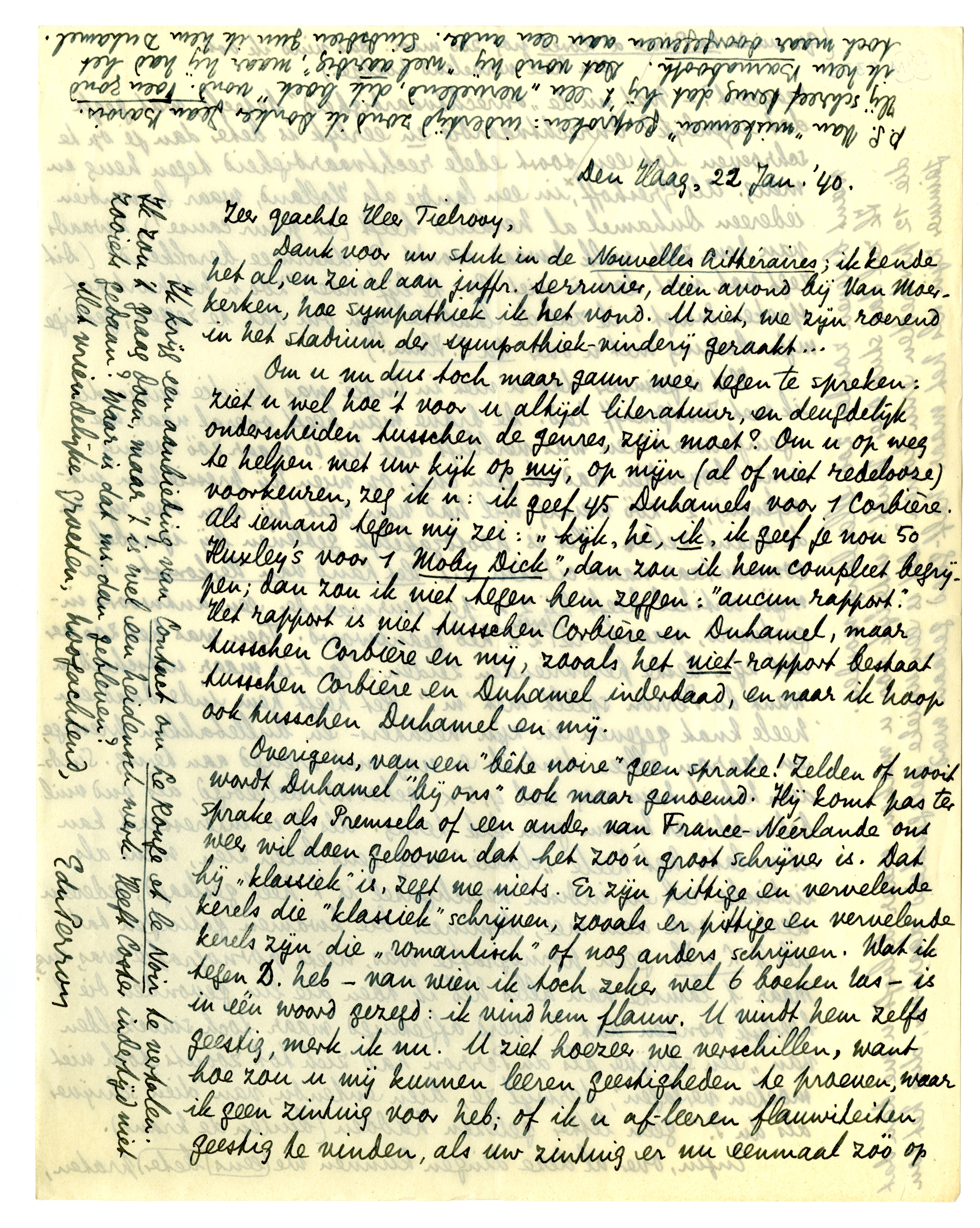Overigens, van een ‘bête noire’ geen sprake! Zelden of nooit wordt Duhamel ‘bij ons’ ook maar genoemd. Hij komt pas ter sprake als Premsela of een ander van France-Néerlande ons weer wil doen gelooven dat het zoo'n groot schrijver is.6662 Dat hij ‘klassiek’ is, zegt me niets. Er zijn pittige en vervelende kerels die ‘klassiek’ schrijven, zooals er pittige en vervelende kerels zijn die ‘romantisch’ of nog anders schrijven. Wat ik tegen D. heb - van wien ik toch zeker wel 6 boeken las - is in één woord gezegd: ik vind hem flauw. U vindt hem zelfs geestig, merk ik nu. U ziet hoezeer we verschillen, want hoe zou u mij kunnen leeren geestigheden te proeven, waar ik geen zintuig voor heb; of ik u af-leeren flauwiteiten geestig te vinden, als uw zintuig er nu eenmaal zóó op reageert? - Wat nu de ‘onrechtvaardigheid’ betreft, wat geeft dat eigenlijk? Onrechtvaardig en eerlijk is beter dan je op te schroeven tot een soort edele rechtvaardigheid tegen heug en meug. Als Greshoff, in een landje als Holland, waar bovendien iedereen Duhamel al herkend heeft (et pour cause!), kwaads van hem zegt,6663 welk kwaad wordt D. daarmee berokkend? (Dit zegt nat. niet dat ù niet Gr. te lijf moet, ‘zoo u het hart tot spreken dringt’, ik zal de laatste zijn om dat te zeggen, getuige mijn botsing niet u over La C. Hum.!)