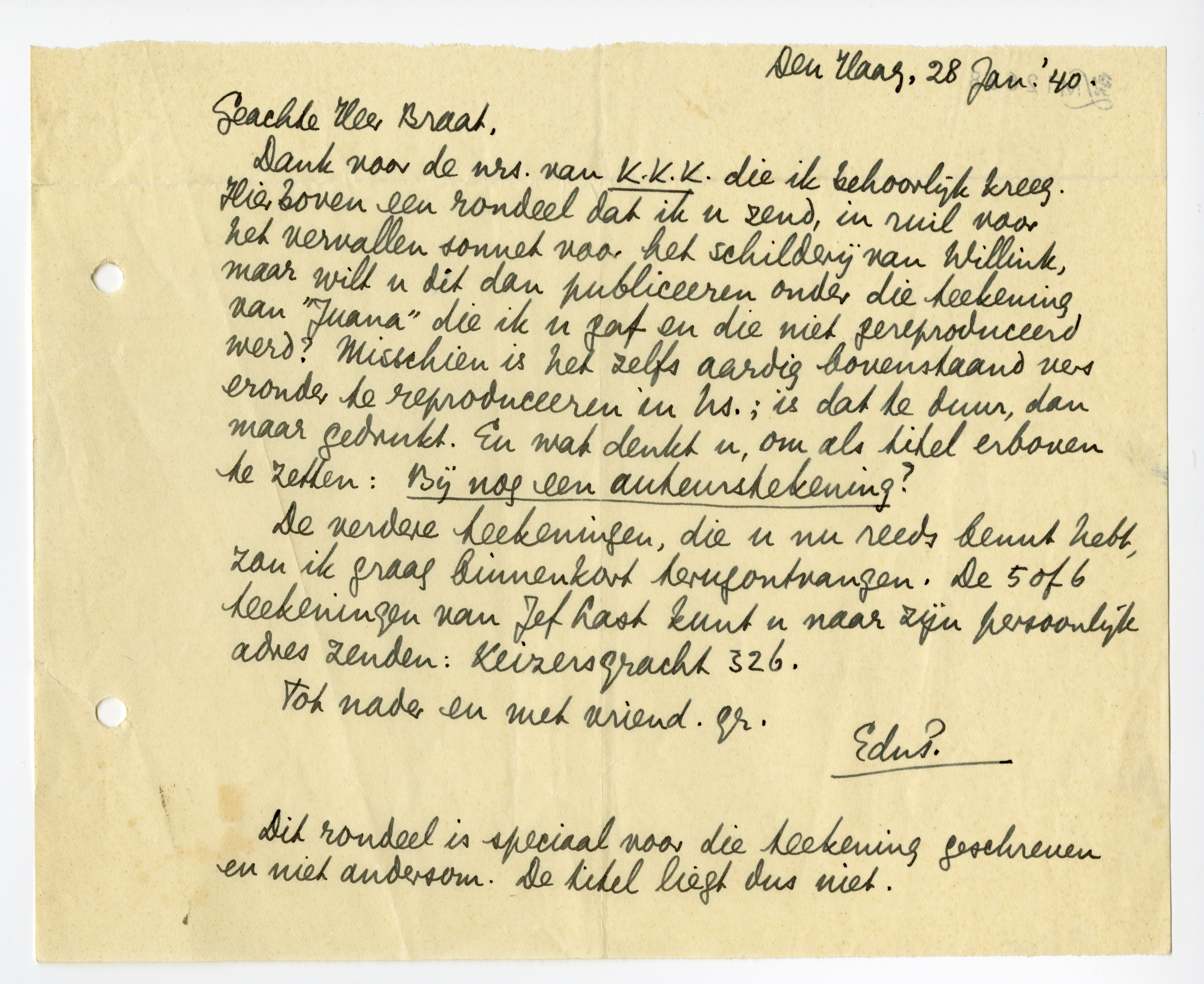De verdere teekeningen, die u nu reeds benut hebt, zou ik graag binnenkort terugontvangen. De 5 of 6 teekeningen van Jef Last kunt u naar zijn persoonlijk adres zenden: Keizersgracht 326.