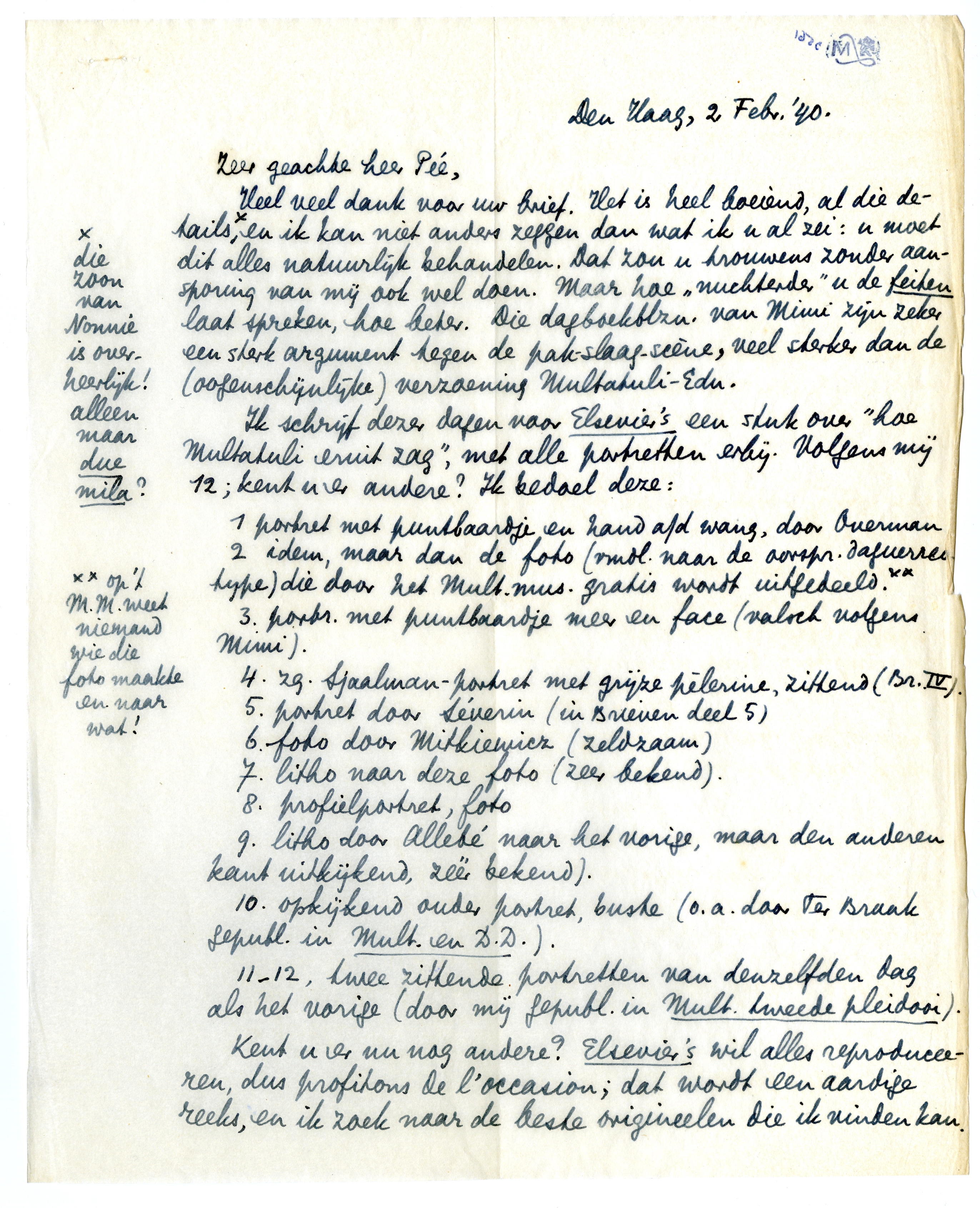 Heel veel dank voor uw brief. Het is heel boeiend, al die details,* en ik kan niet anders zeggen dan wat ik u al zei: u moet dit alles natuurlijk behandelen. Dat zou u trouwens zonder aansporing van mij ook wel doen. Maar hoe ‘nuchterder’ u de feiten laat spreken, hoe beter. Die dagboekblzn. van Mimi zijn zeker een sterk argument tegen de pak-slaag-scène, veel sterker dan de (oogenschijnlijke) verzoening Multatuli-Edu.