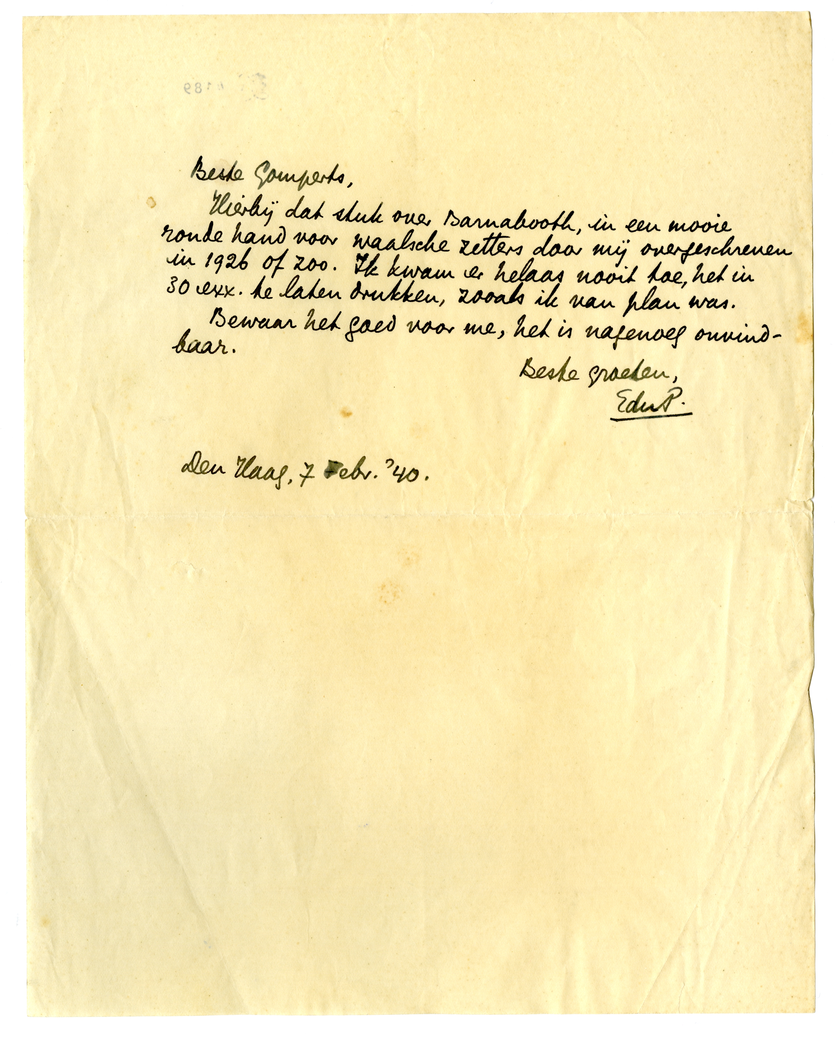 Hierbij dat stuk over Barnabooth,6713 in een mooie ronde hand voor waalsche zetters door mij overgeschreven in 1926 of zoo. Ik kwam er helaas nooit toe, het in 30 exx. te laten drukken, zooals ik van plan was.